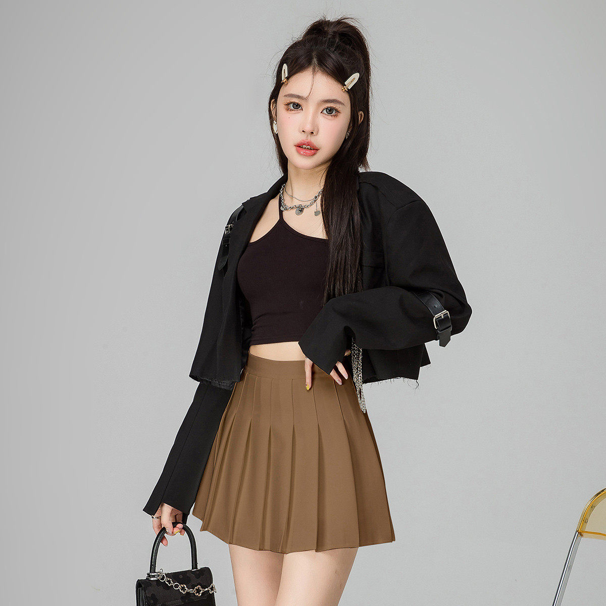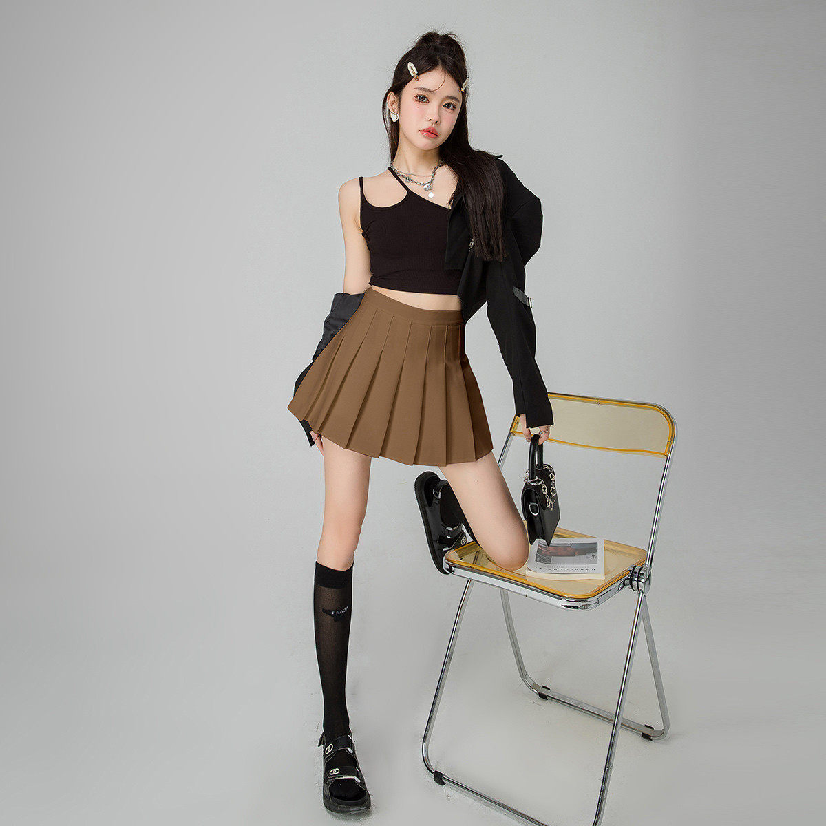 one more卡其色百褶裙女夏季半身裙a字短裙2025新款高腰显瘦jk裙