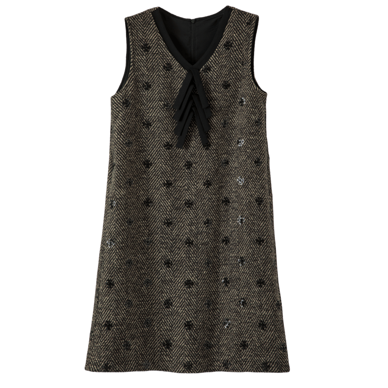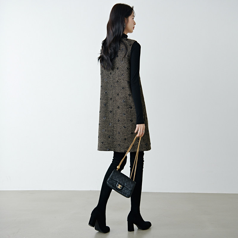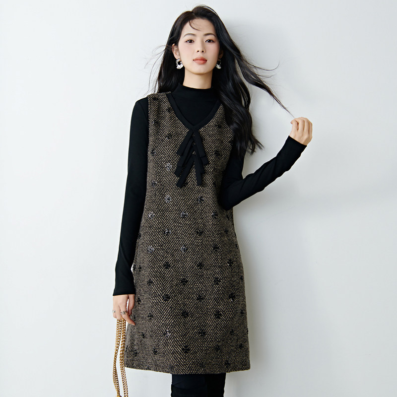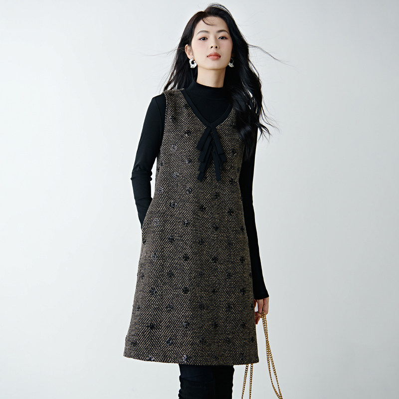 V领黑色麦穗边,亮片花点缀,无袖设计