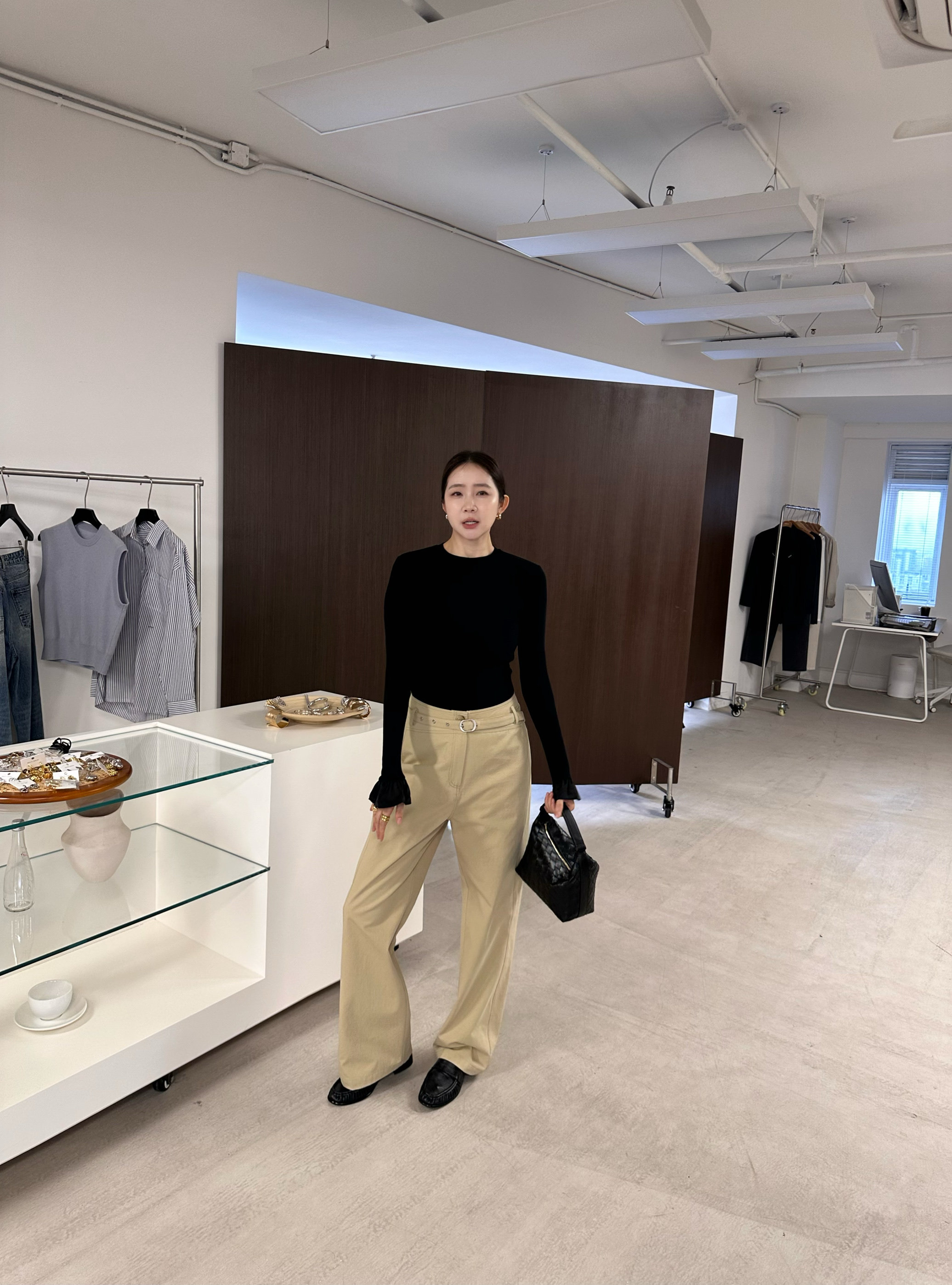 WIDELIA设计感花边喇叭袖外穿打底上衣女圆领修身显瘦百搭长袖t恤