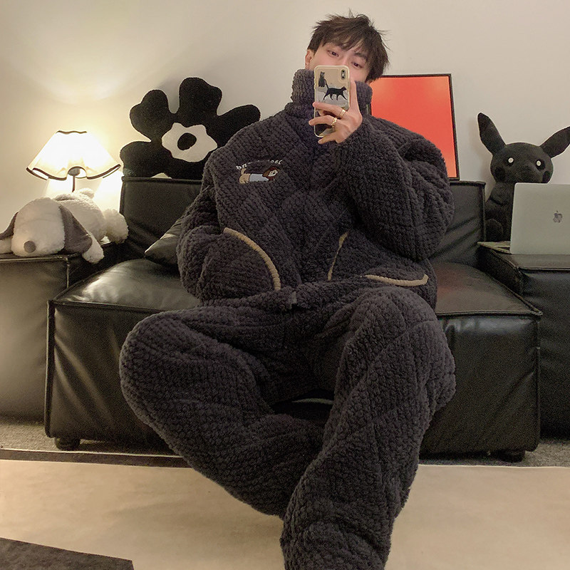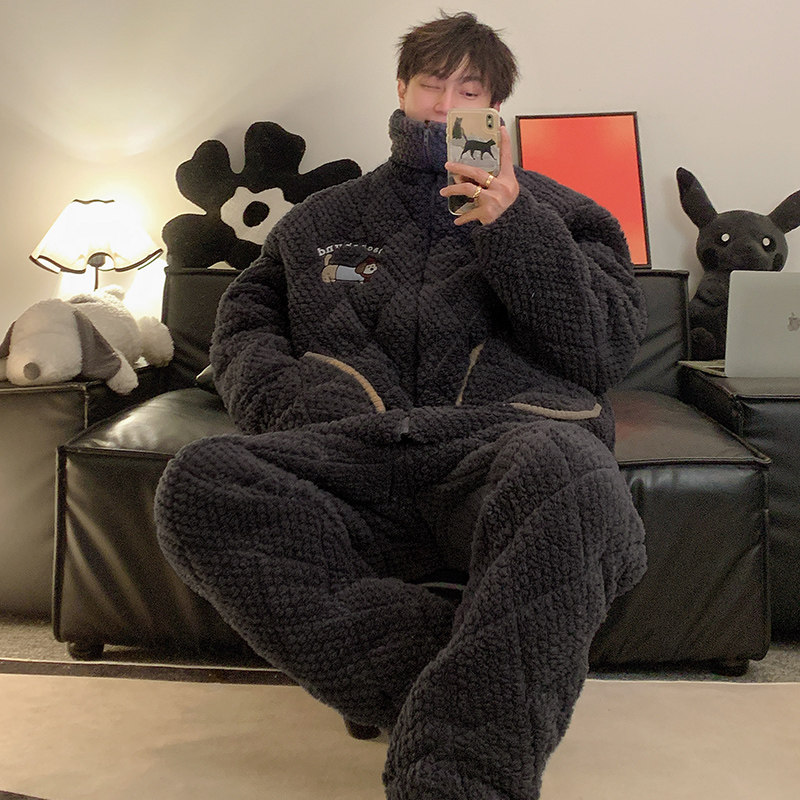 秋冬款加厚珊瑚绒睡衣男三层夹棉法兰绒大码男士可外穿家居服套装