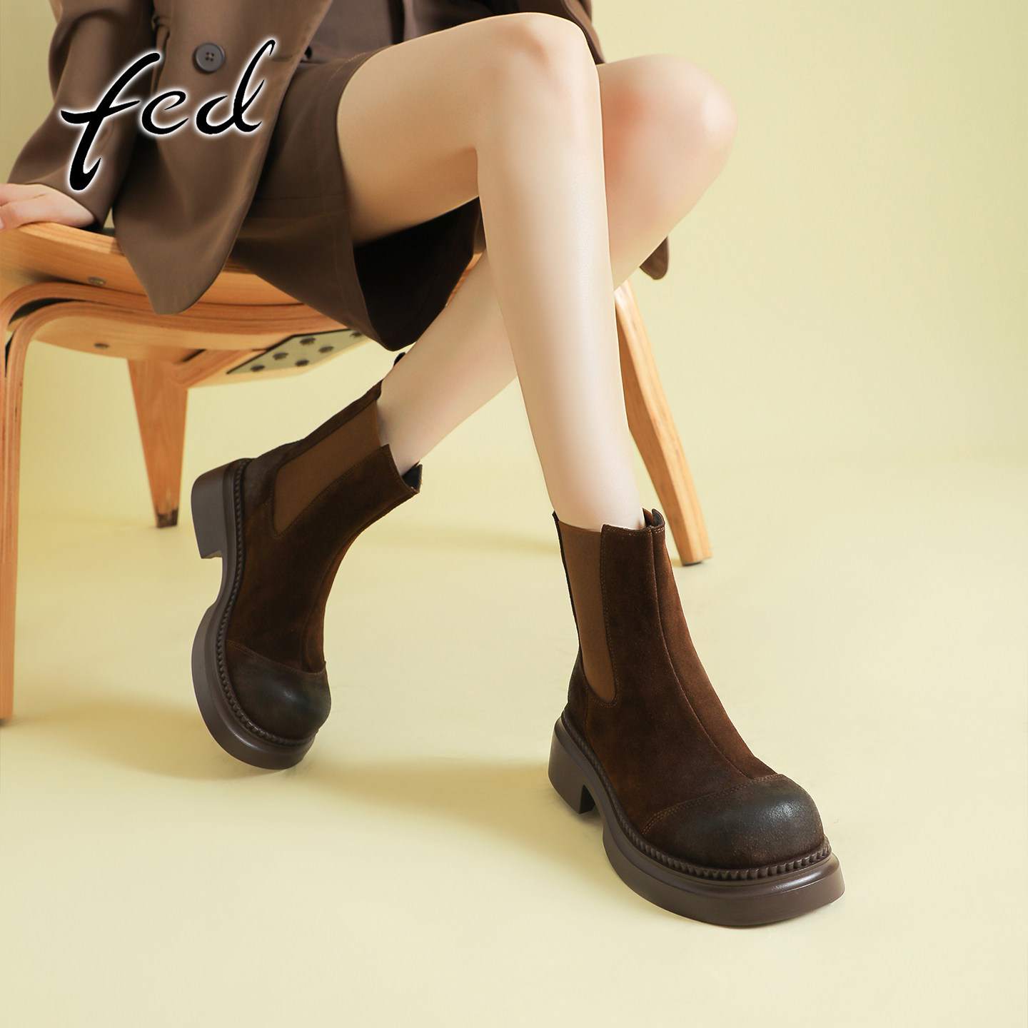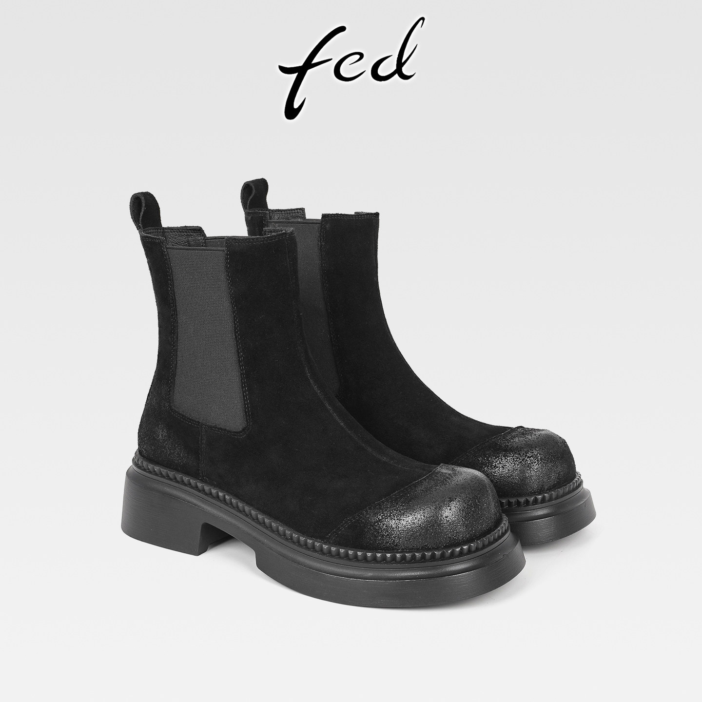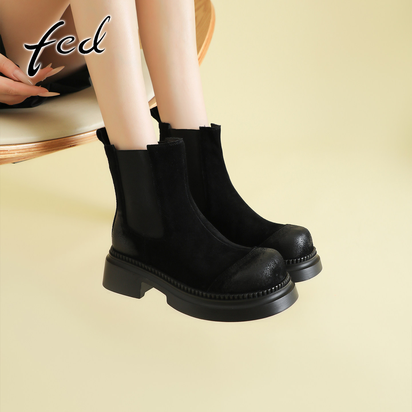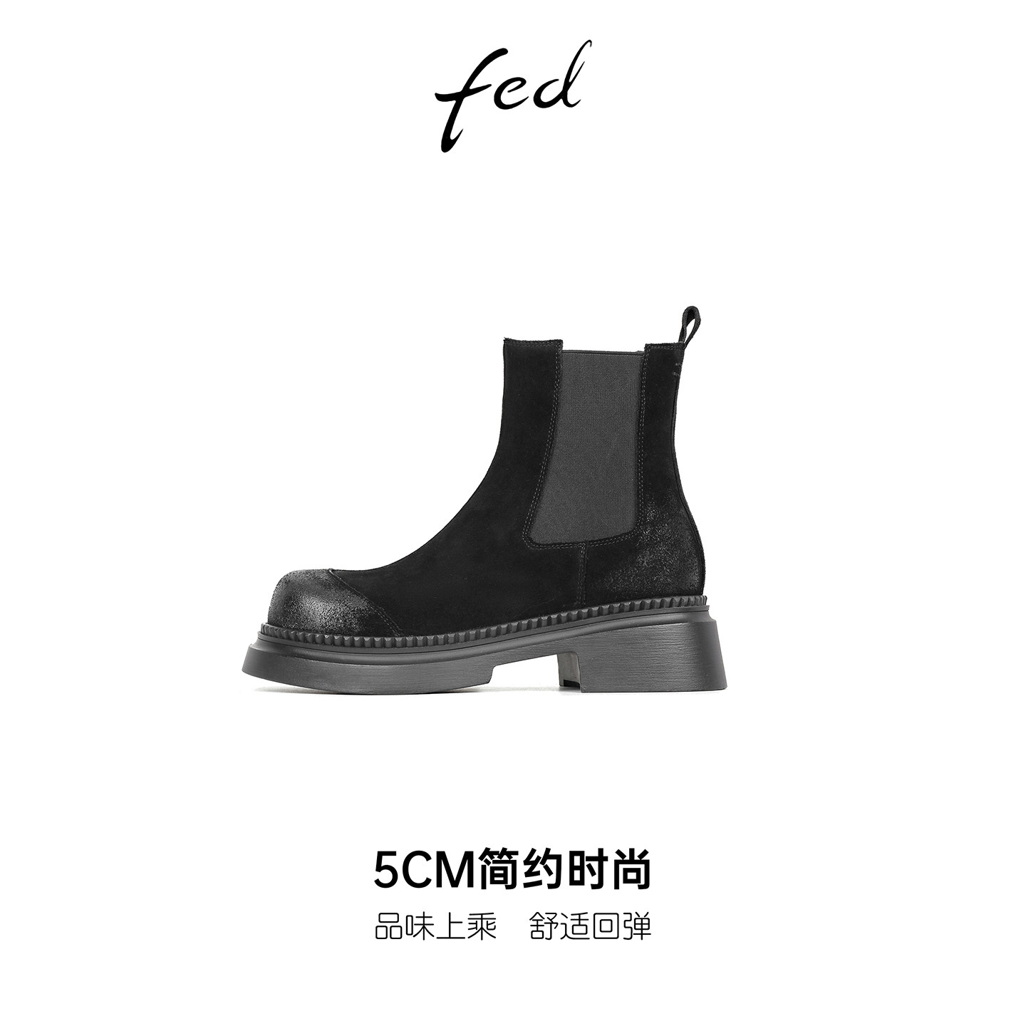 fed复古擦色牛反绒粗跟厚底切尔西靴女秋冬新款圆头高跟显瘦短靴