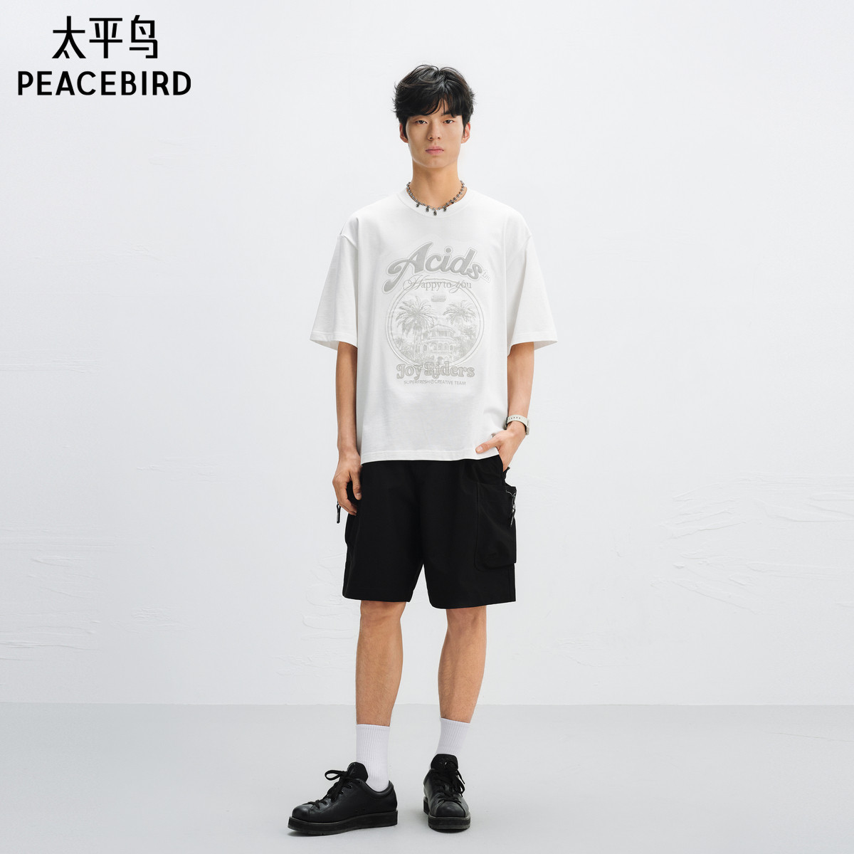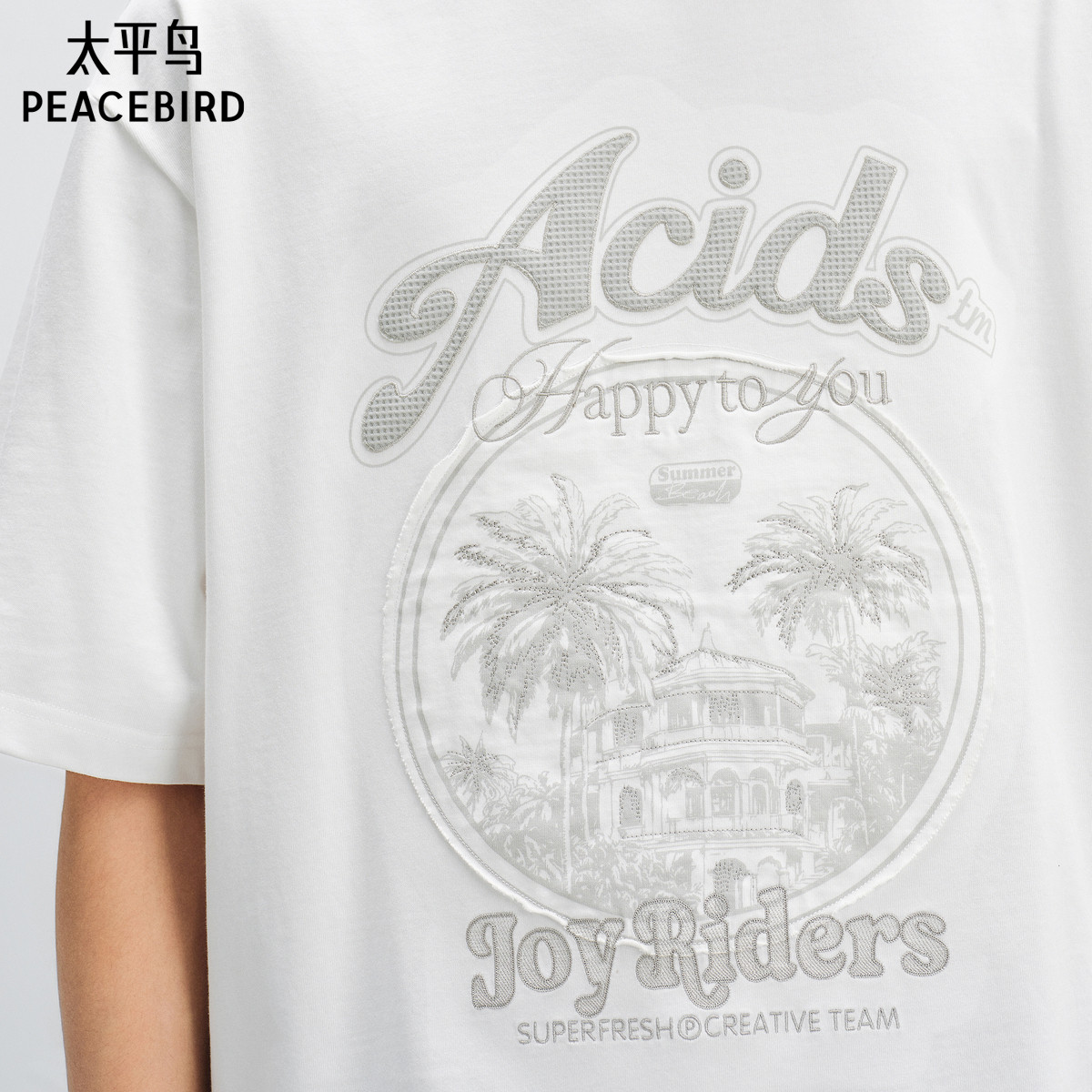 太平鸟男装 白色刺绣印花短袖T恤重磅体恤衫潮牌半袖t恤男