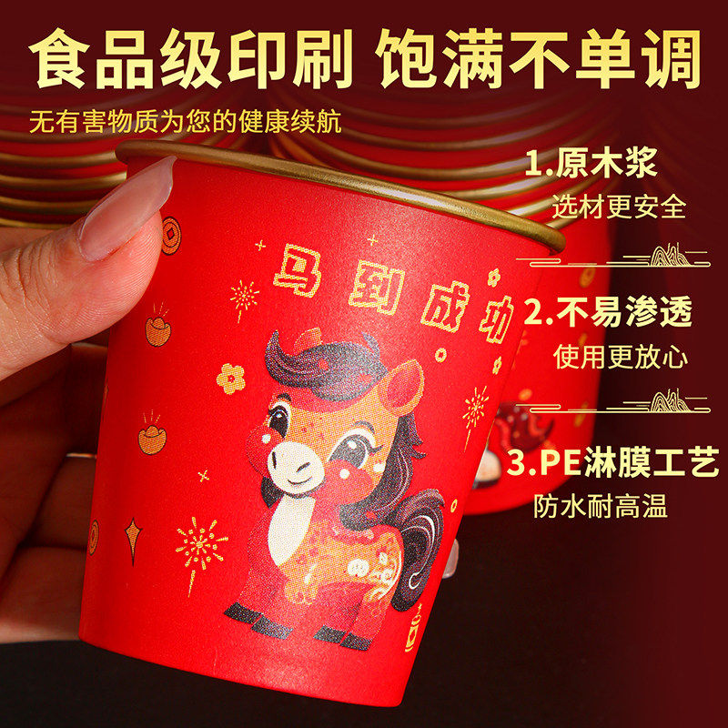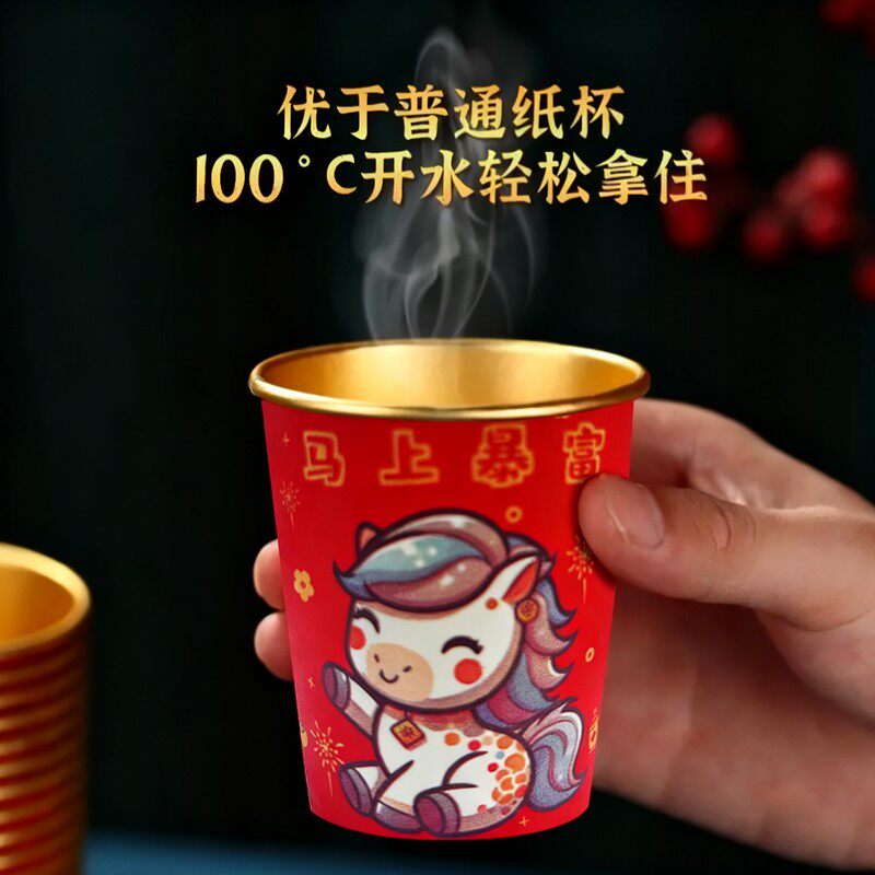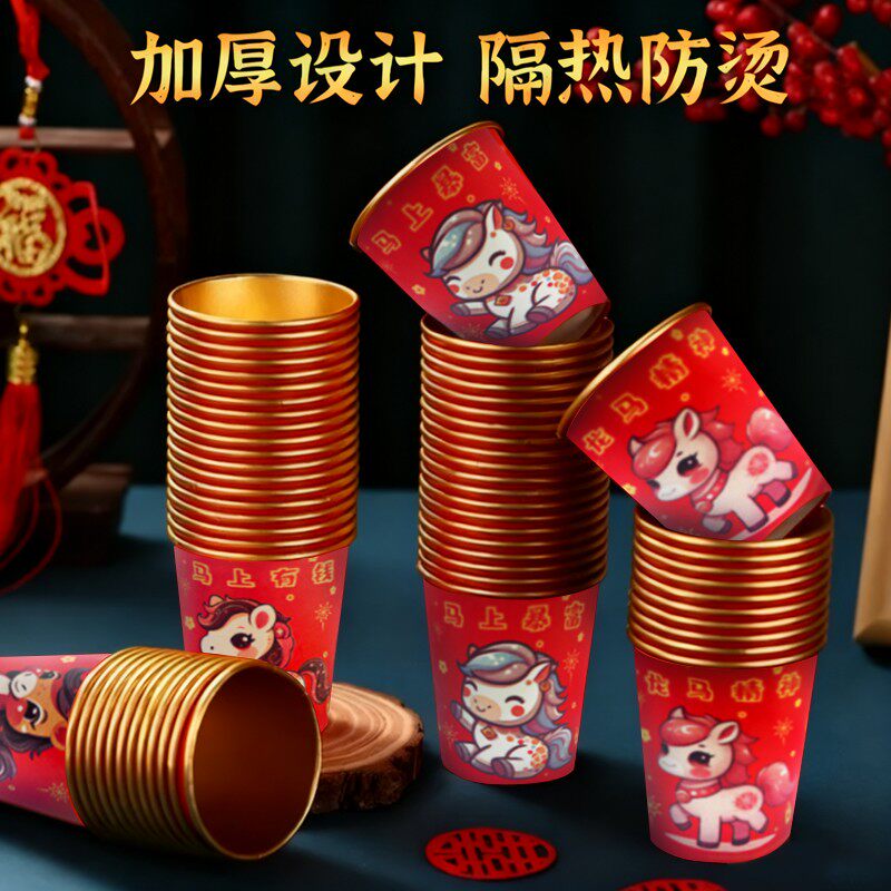 过年2026马年一次性纸杯杯子水杯家用加厚金箔新年春节喜庆食品级