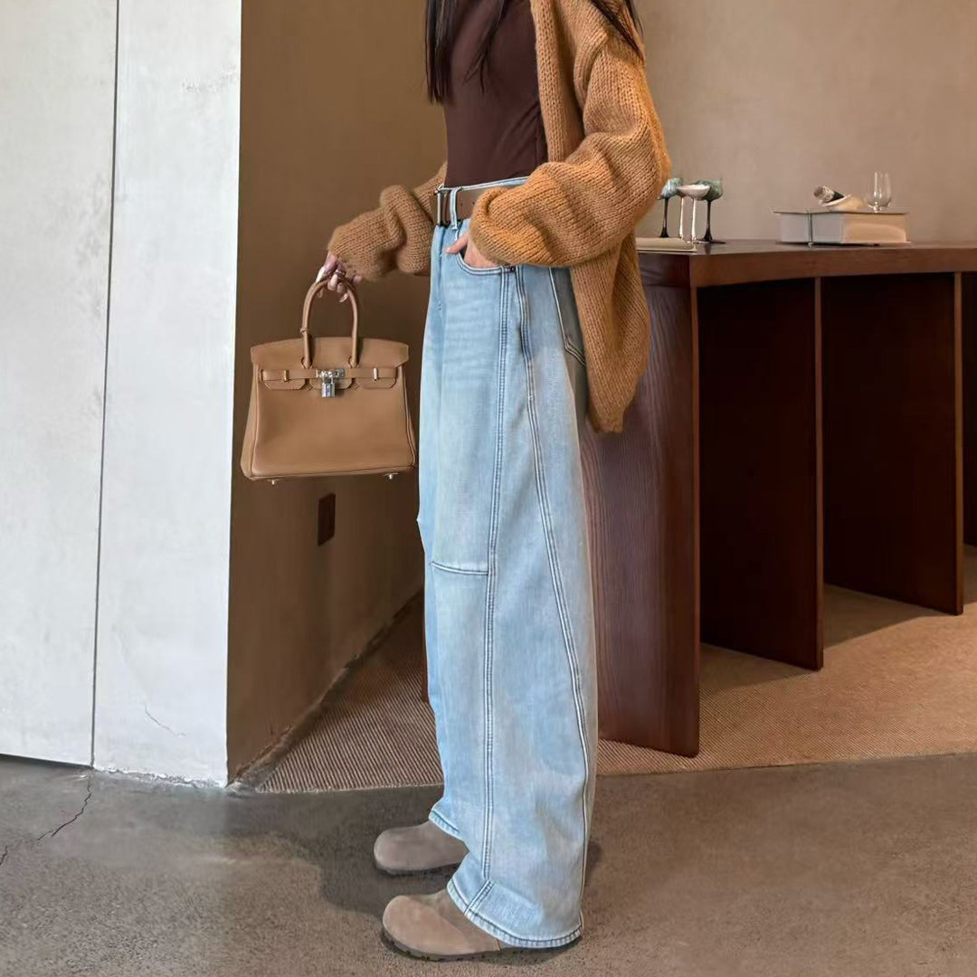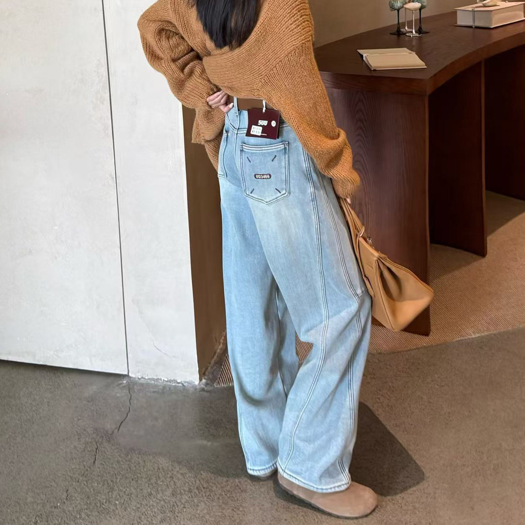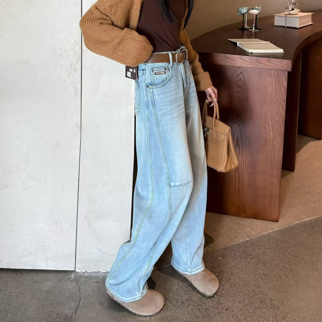 2025冬新款浅蓝色加绒加厚牛仔弯刀裤女宽松高腰长裤阔腿拖地裤子
