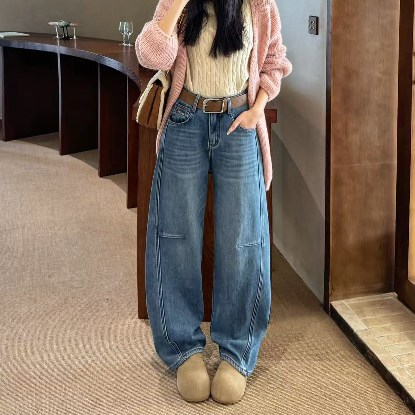 王家有鱼秋冬新款加绒阔腿裤2025百搭修身显瘦宽松直筒牛仔裤子女