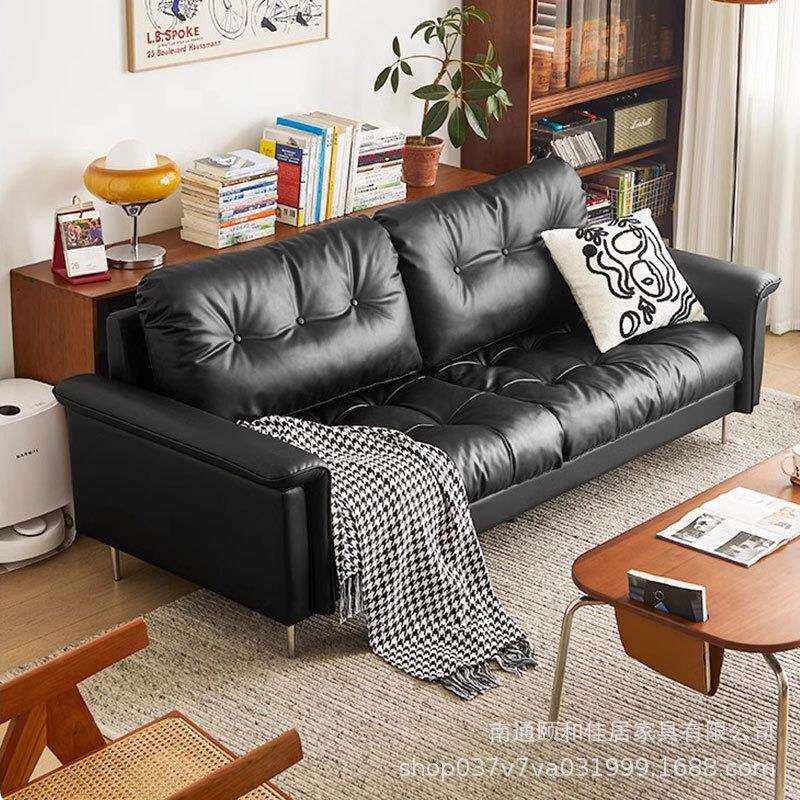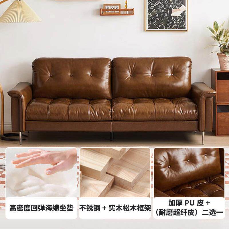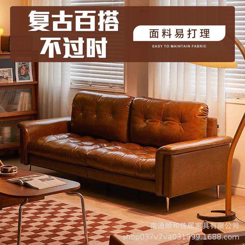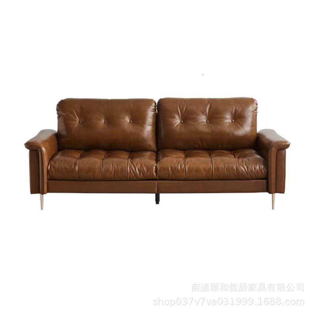 法式复古沙发美式直排小户型 北欧中古风三人位油蜡皮艺拉扣沙发