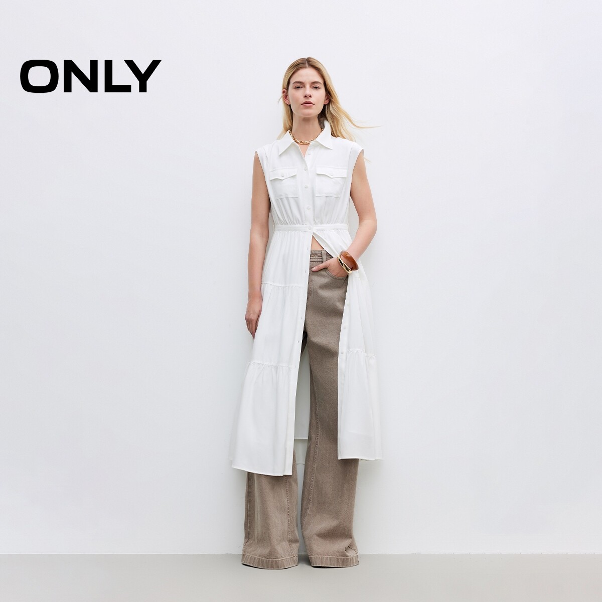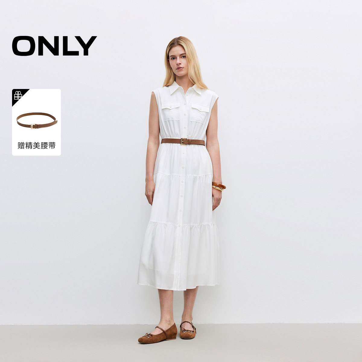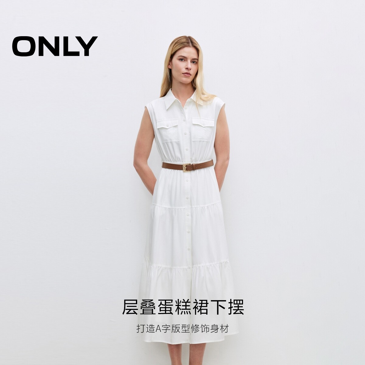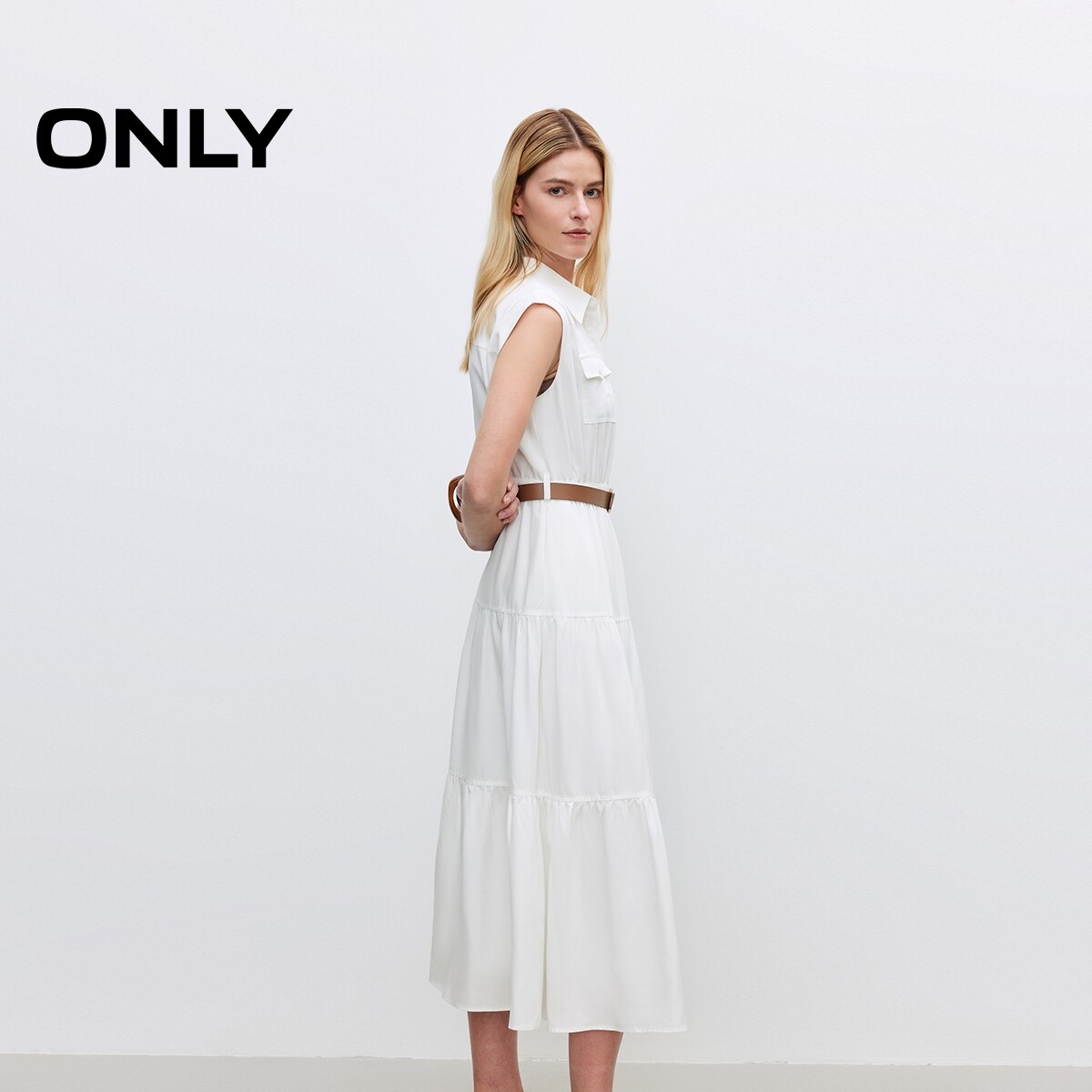 ONLY2026春季新款含莱赛尔亚麻收腰无袖翻领白色蛋糕长连衣裙女