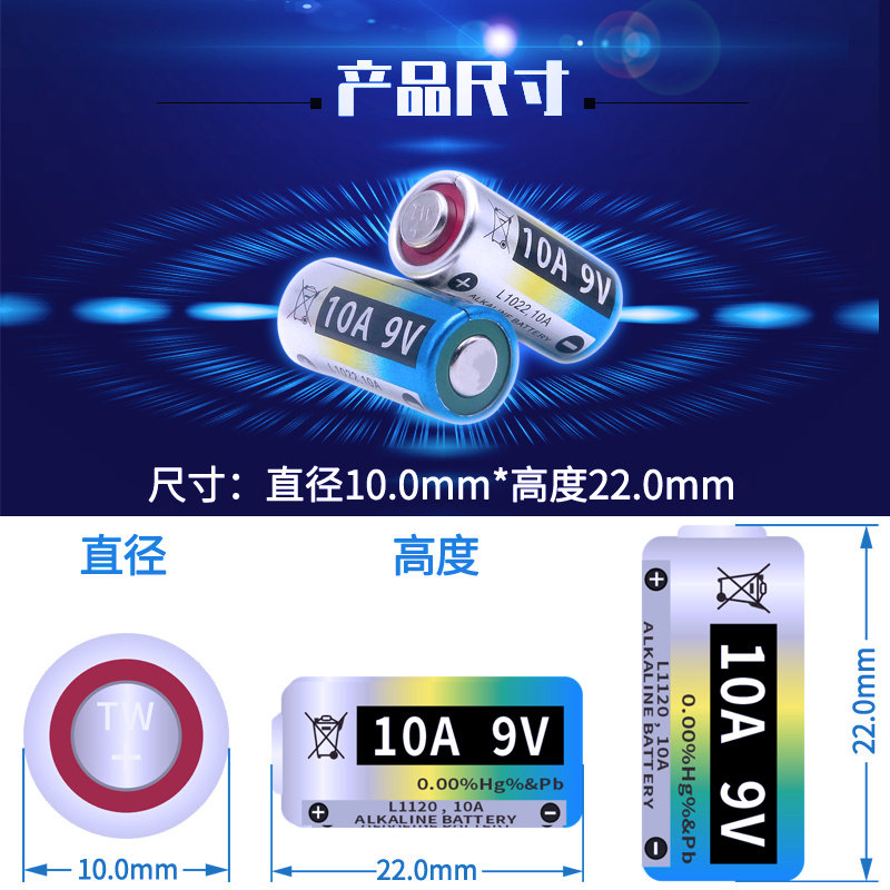 原装10A9V电池L1022碱性高伏短款9V10A车库闸门电动卷帘门小区防盗锁遥控器美容激光笔专用圆柱小电子