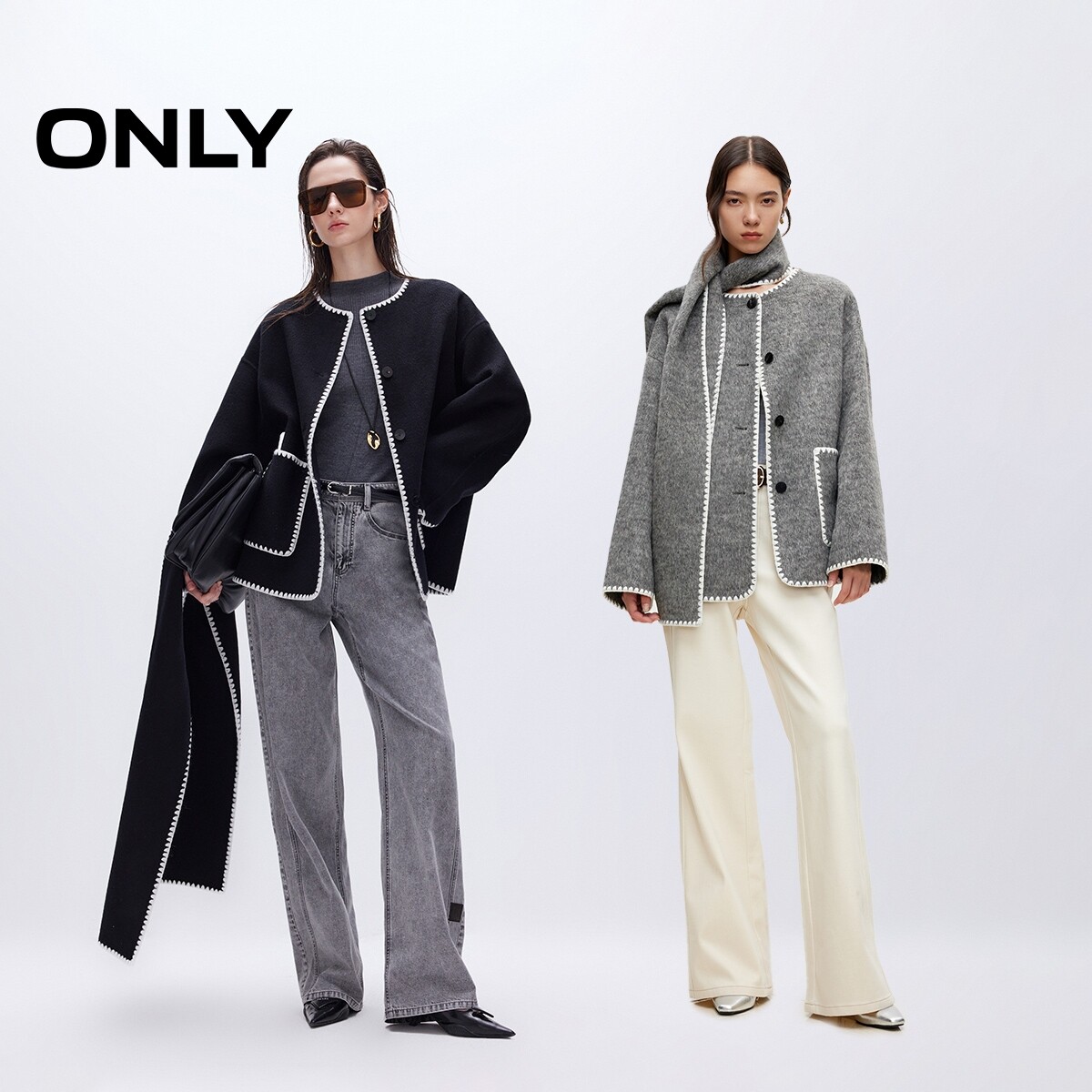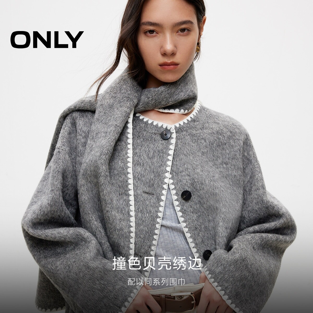 撞色贝壳绣边 质感羊毛混纺 落肩宽松剪裁