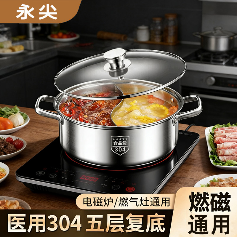 永尖特厚304不锈钢火锅家用两味鸳鸯锅大容量食品级清汤锅打边炉