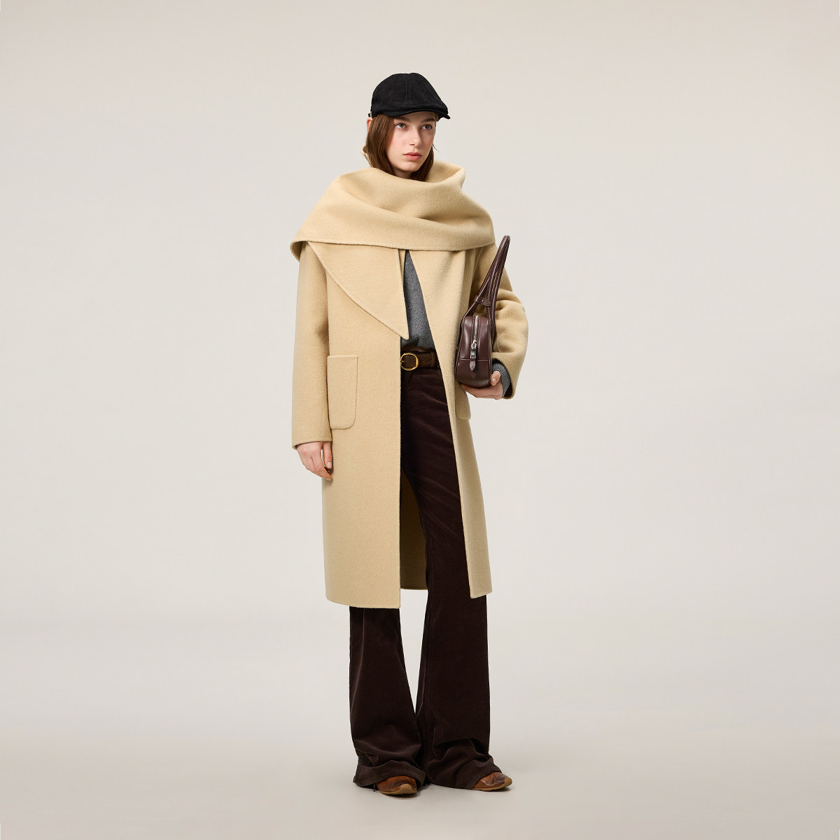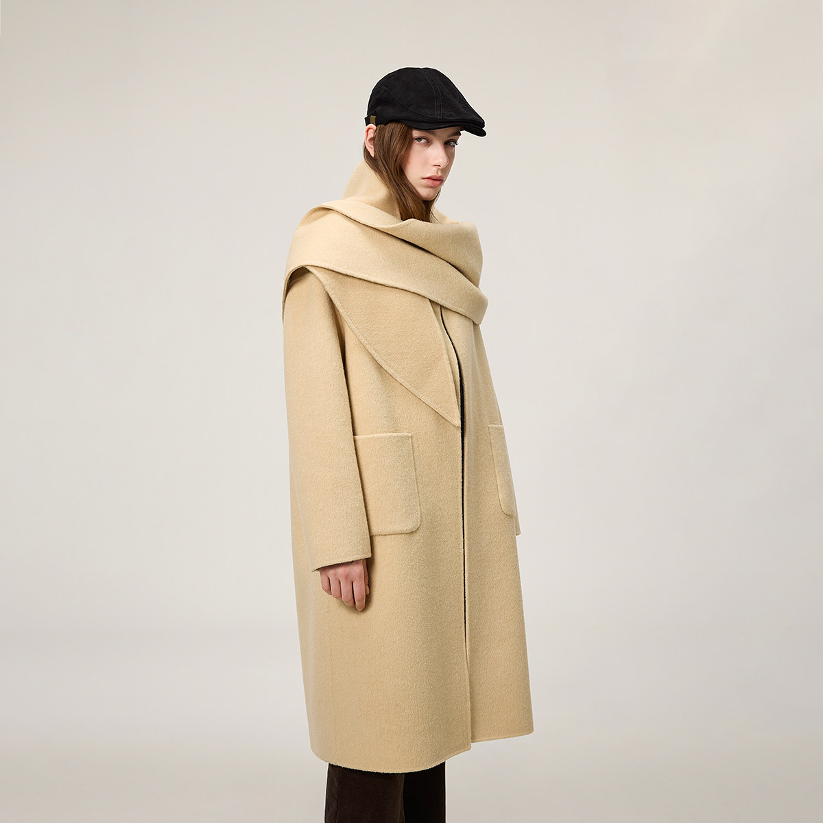 【季末折扣】欧时力羊毛双面呢配围巾大衣慵懒长款外套2025秋冬新