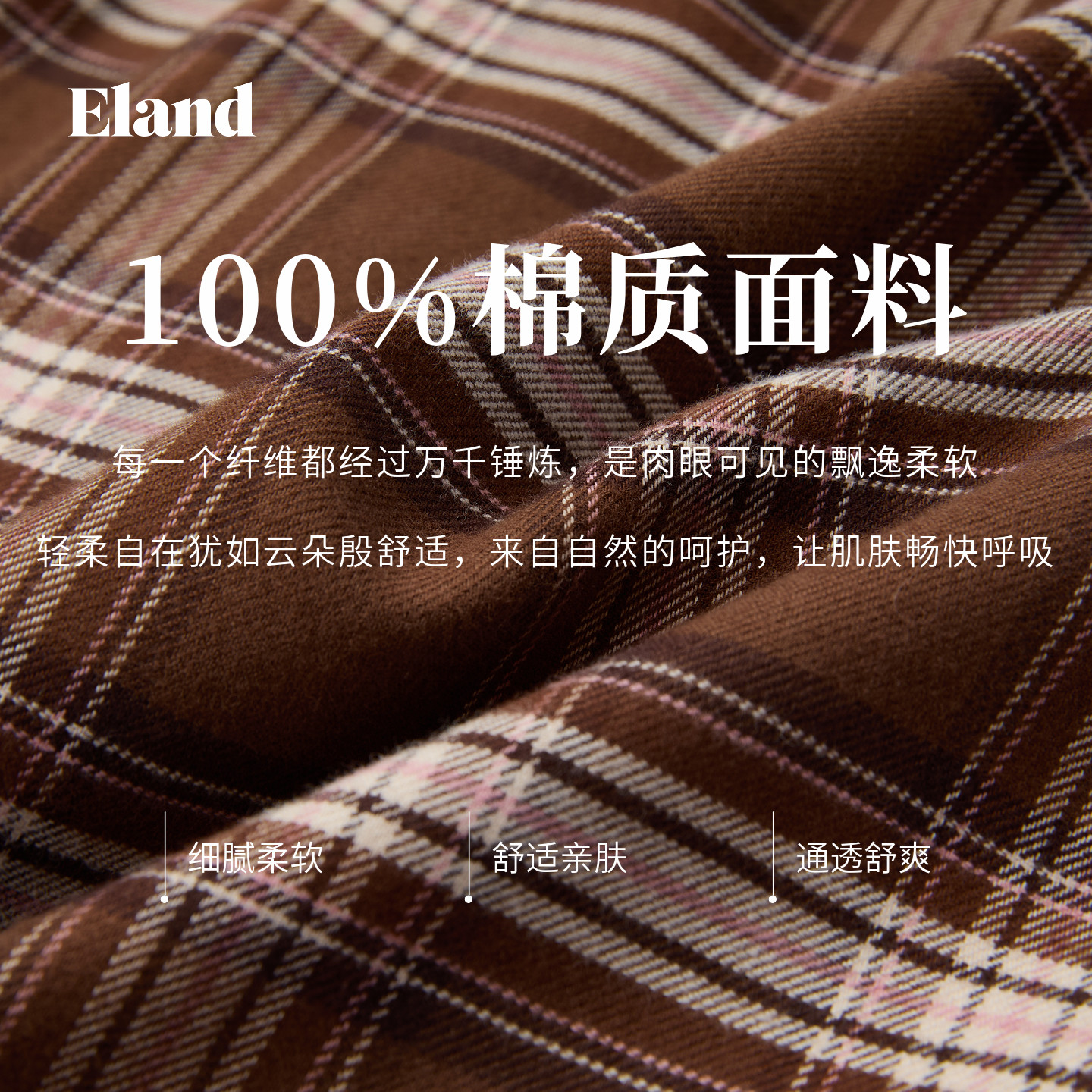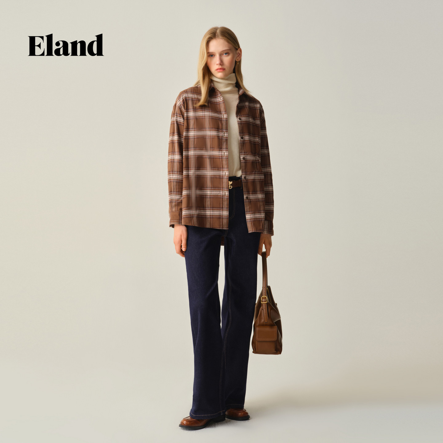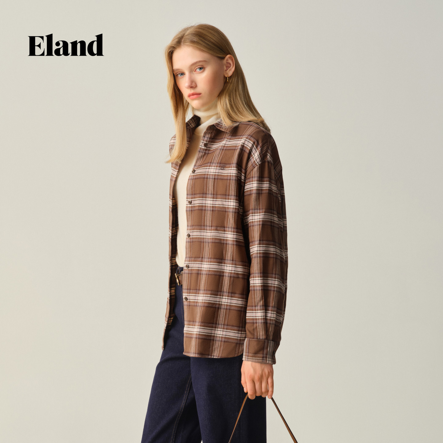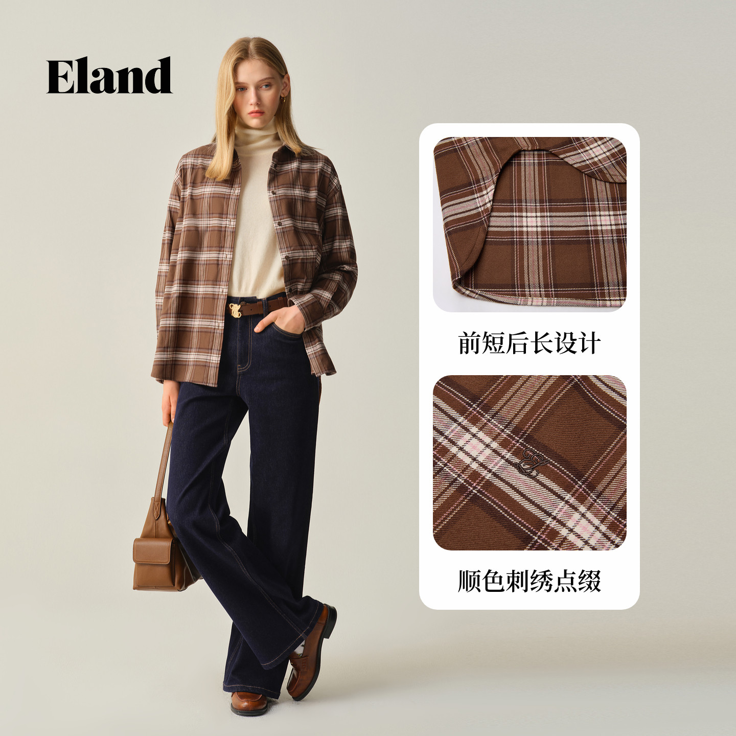 【100%棉】Eland衣恋衬衫女气质翻领格纹长袖通勤上衣2025冬新款