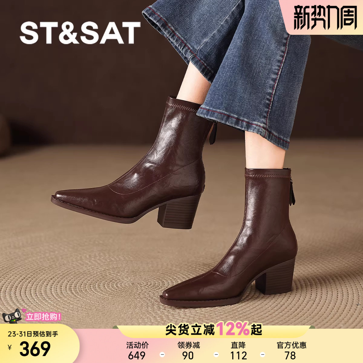 星期六尖头短靴女秋冬新款粗跟高跟鞋棕色瘦瘦靴女士马丁靴直