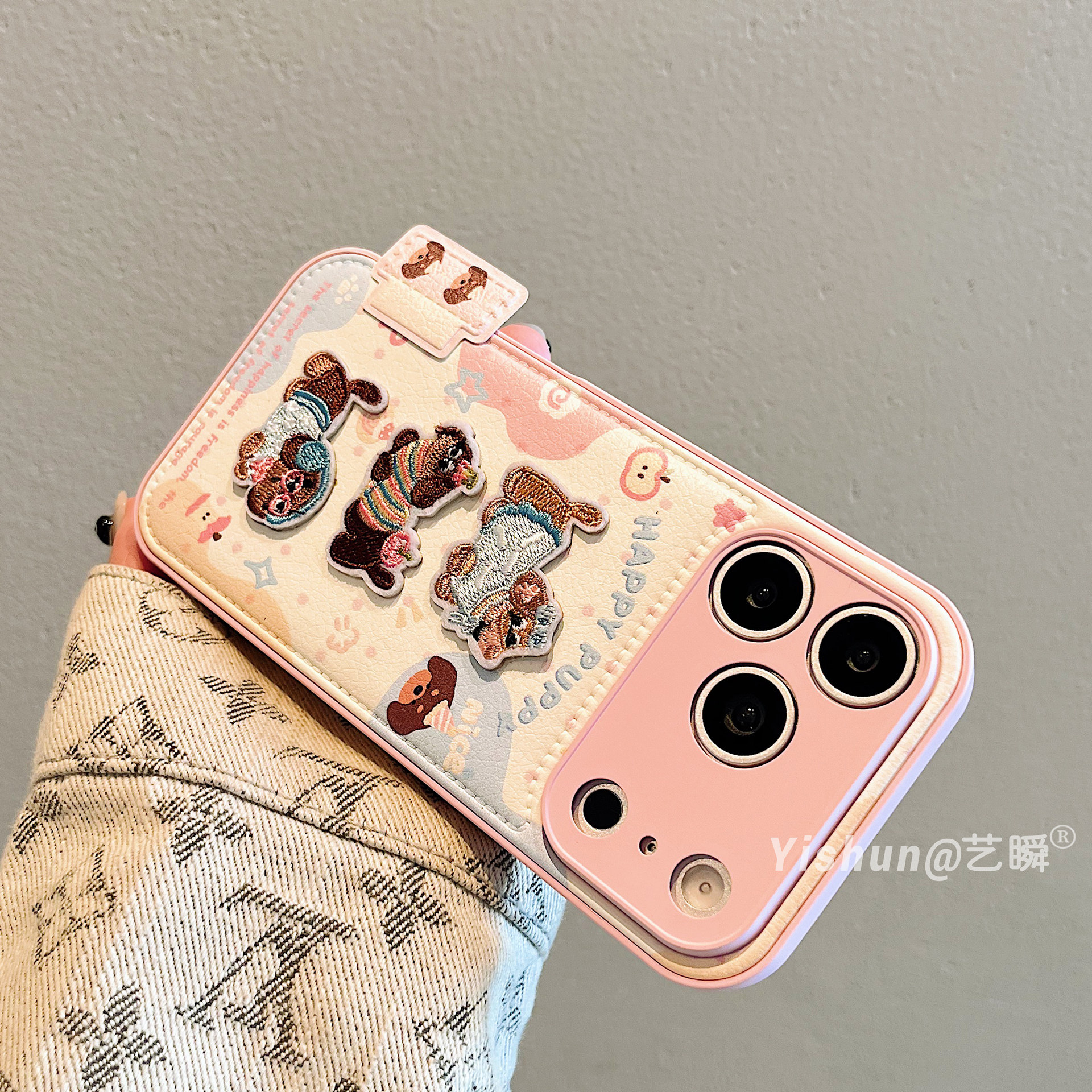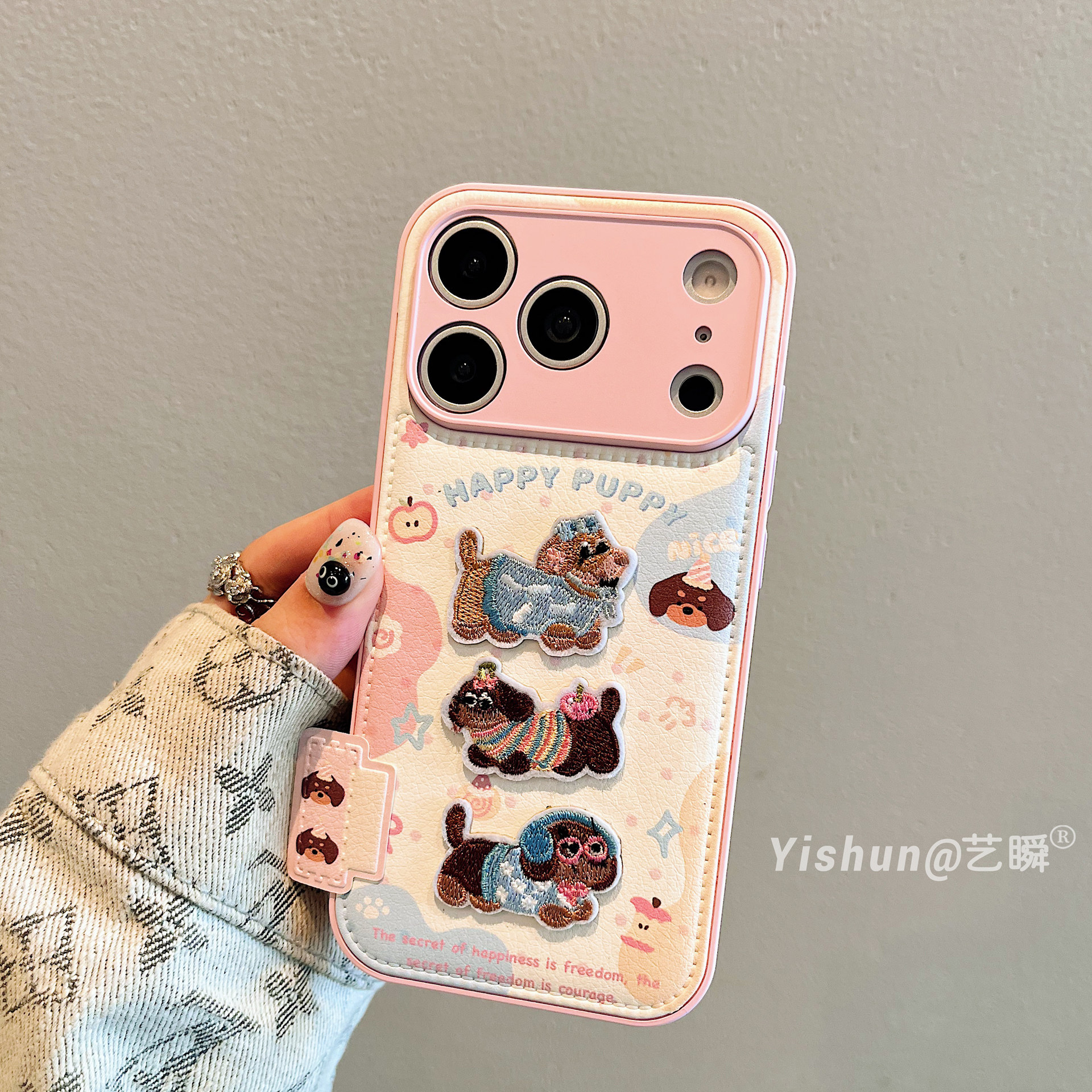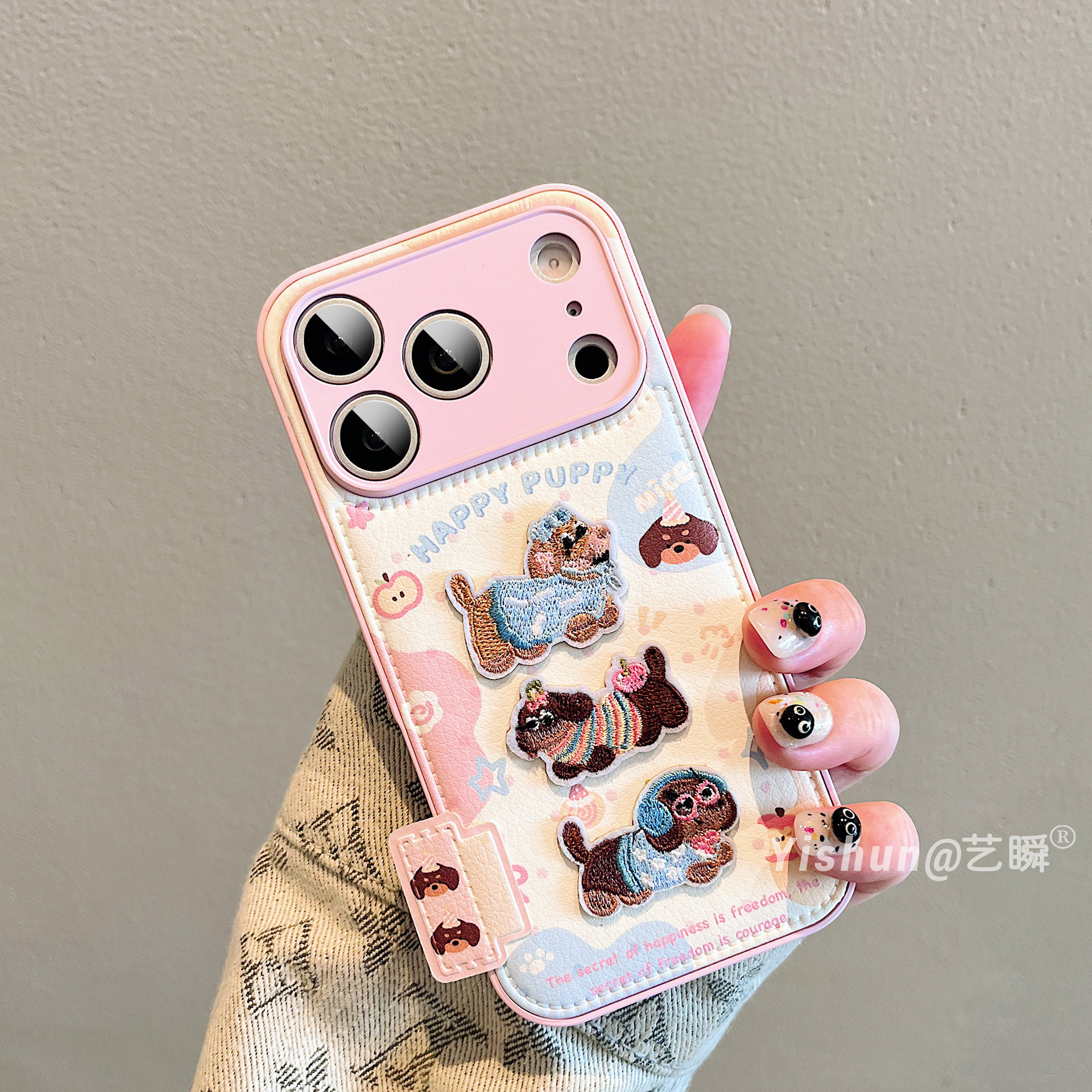 皮质刺绣卡通呆萌可爱小狗适用iPhone17ProMax手机壳苹果16pro新款13镜头全包防摔15pro女款情侣ip14pm保护套