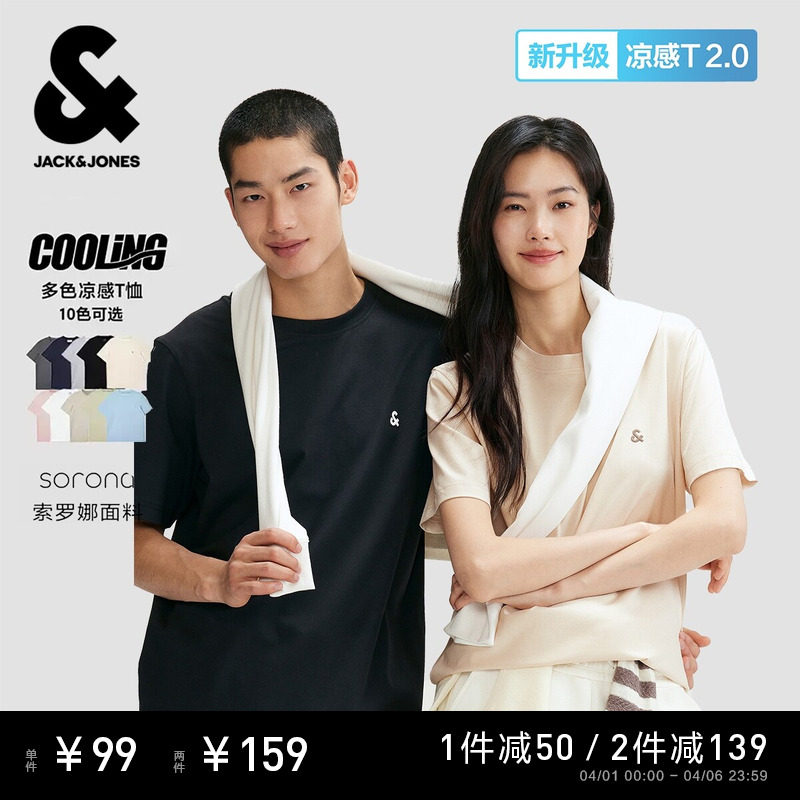 【实穿凉感T】杰克琼斯男装夏新款基础纯色短袖T恤刺绣情侣打底衫