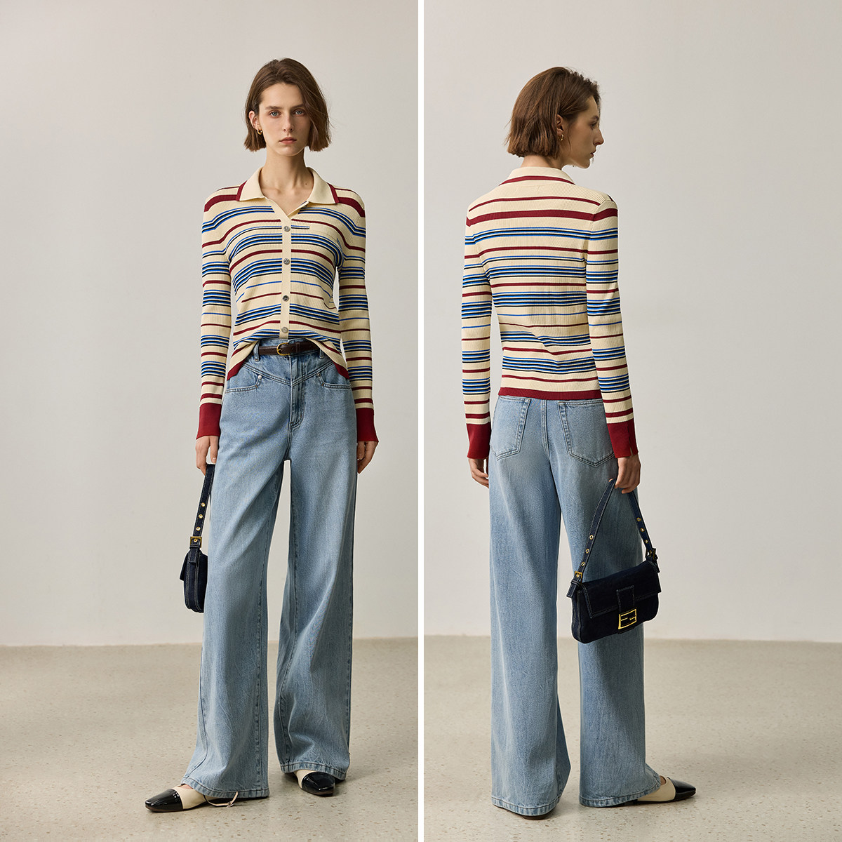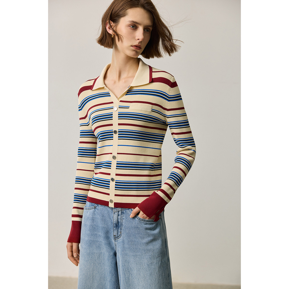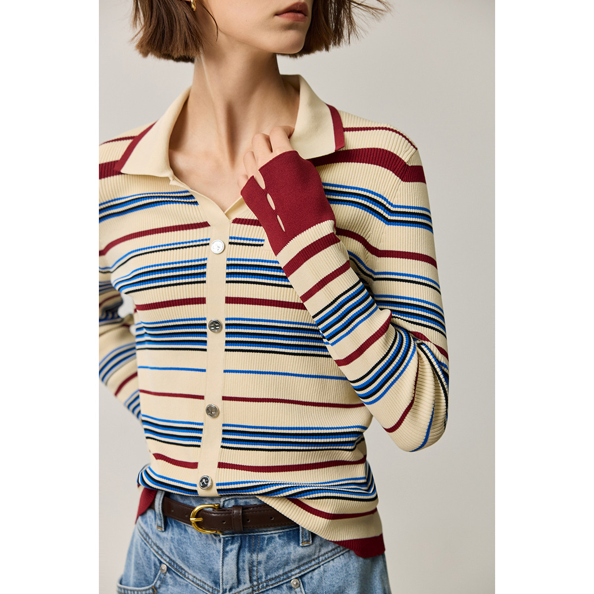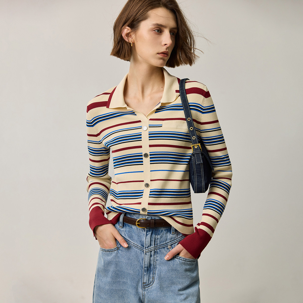 LILY2026夏新款复古翻领气质休闲撞色条纹修身针织开衫外套女短款