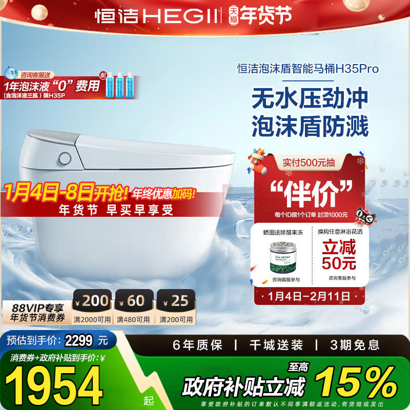 【政府补贴15%】恒洁智能马桶全自动一体感应翻盖泡沫盾H35p