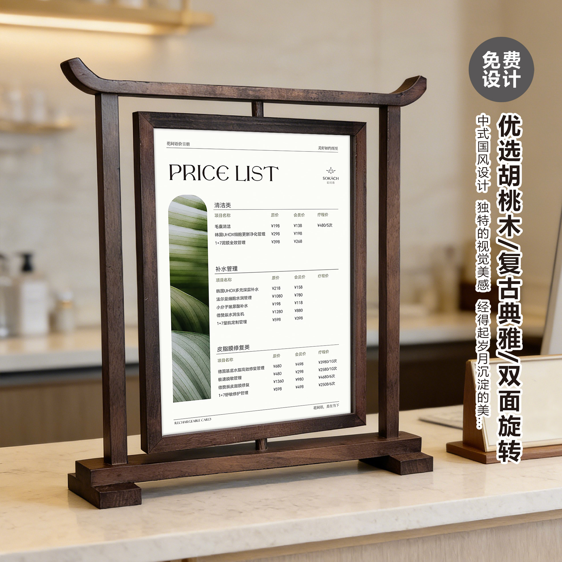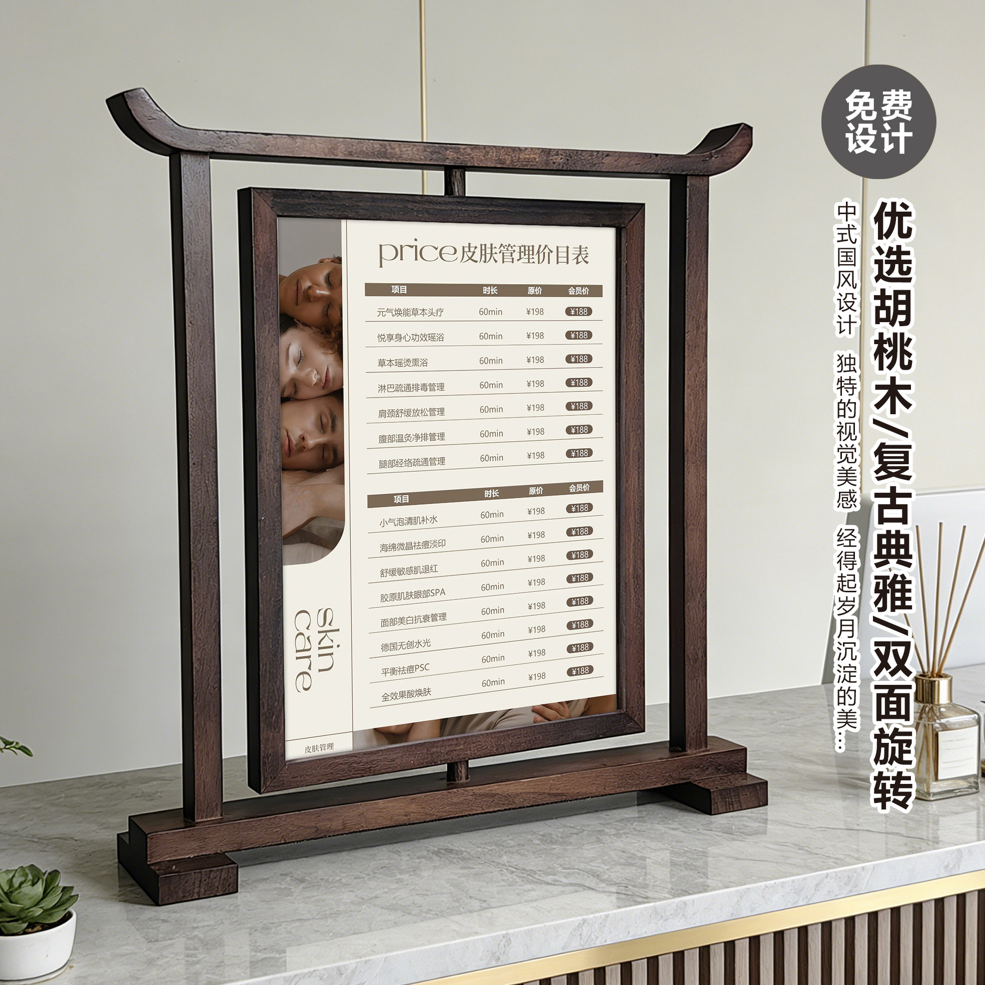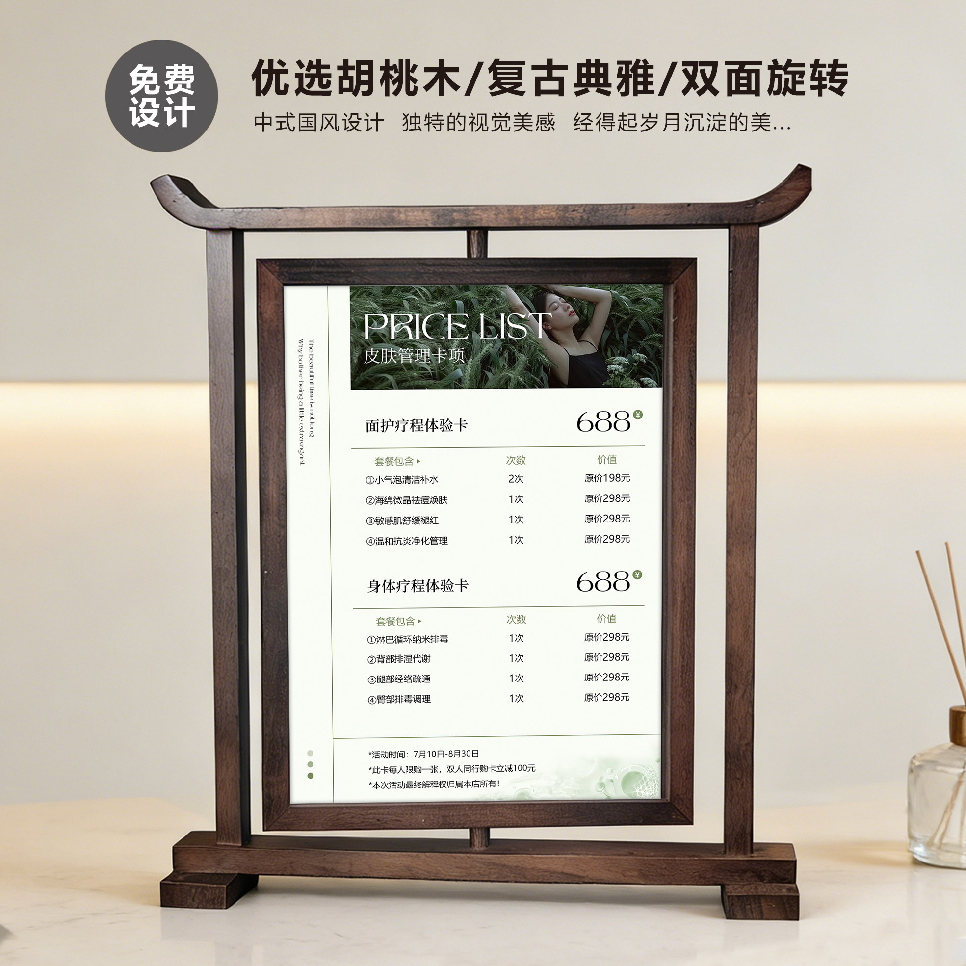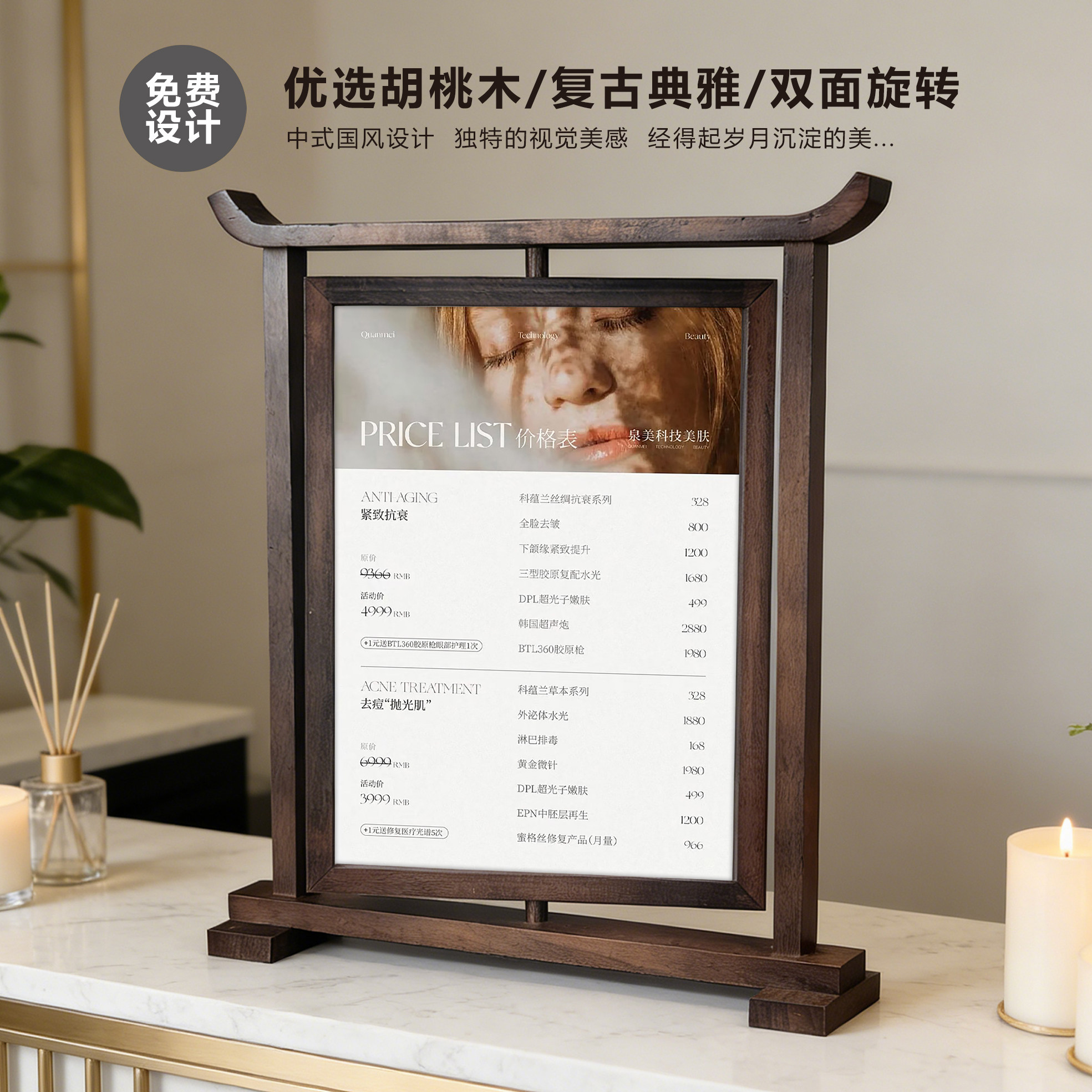 国风胡桃木展示牌美容院价格表设计定制美甲美睫纹绣木质旋转摆台