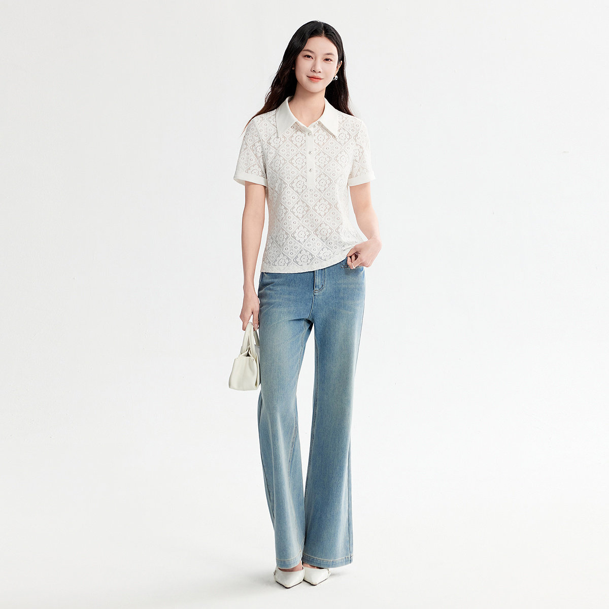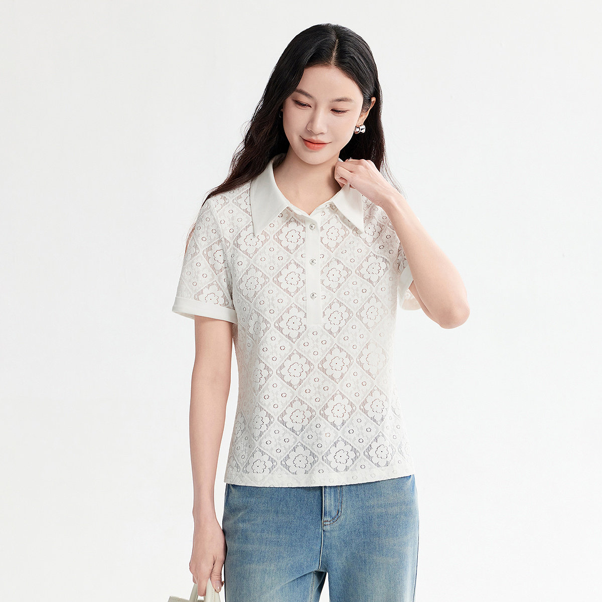 FINITY菲妮迪雪纺衫2026年春季新款简约镂空设计感翻领短袖上衣女