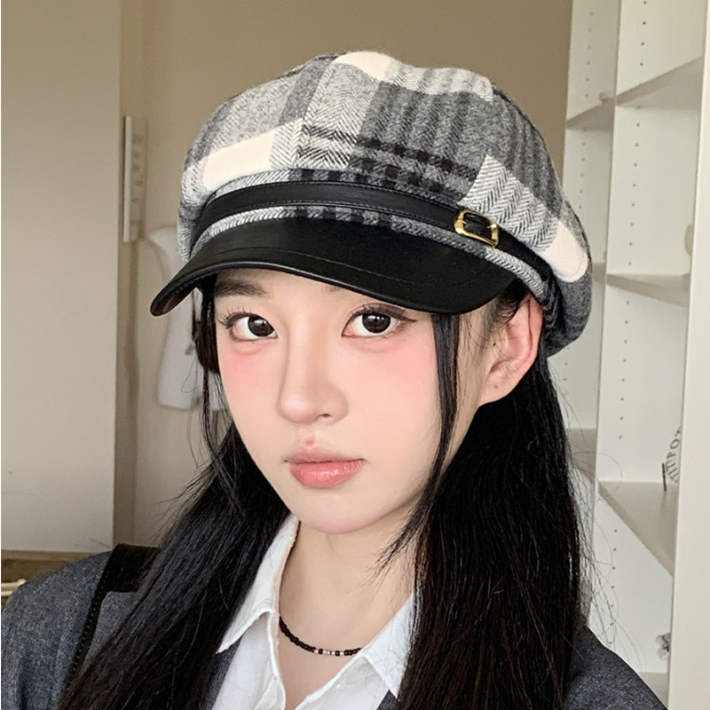 韩版格纹拼接皮檐显脸小八角帽子女英伦复古报童帽百搭画家帽秋冬