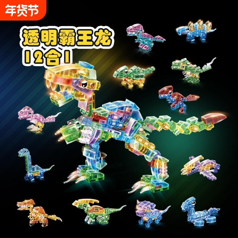 网红新款透明恐龙男孩积木玩具霸王龙儿童三角龙拼装动物模型拼搭