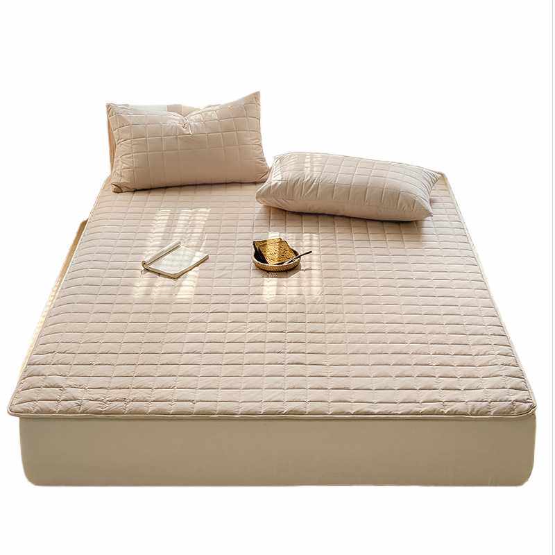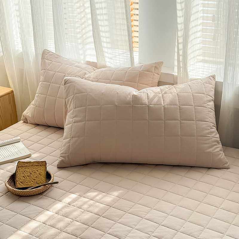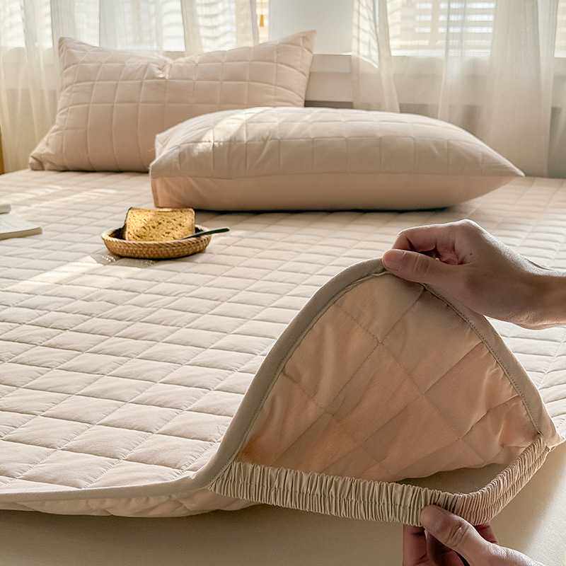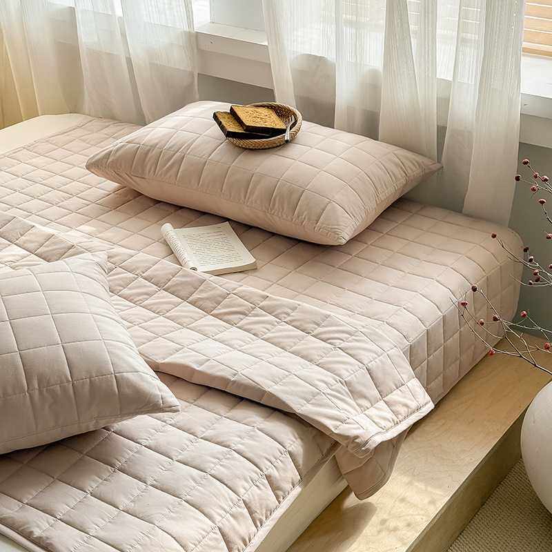 新款日系格子水洗棉夹棉床席纯色简约床垫枕套三件套家用软糯亲肤