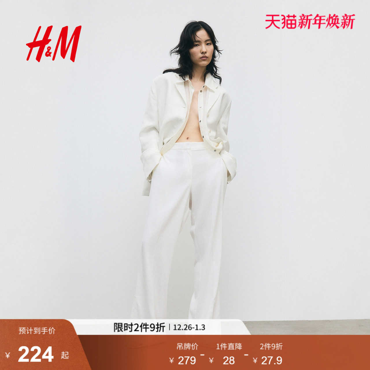 HM女装休闲裤2025年冬季新款亚麻混纺微喇长裤1293464