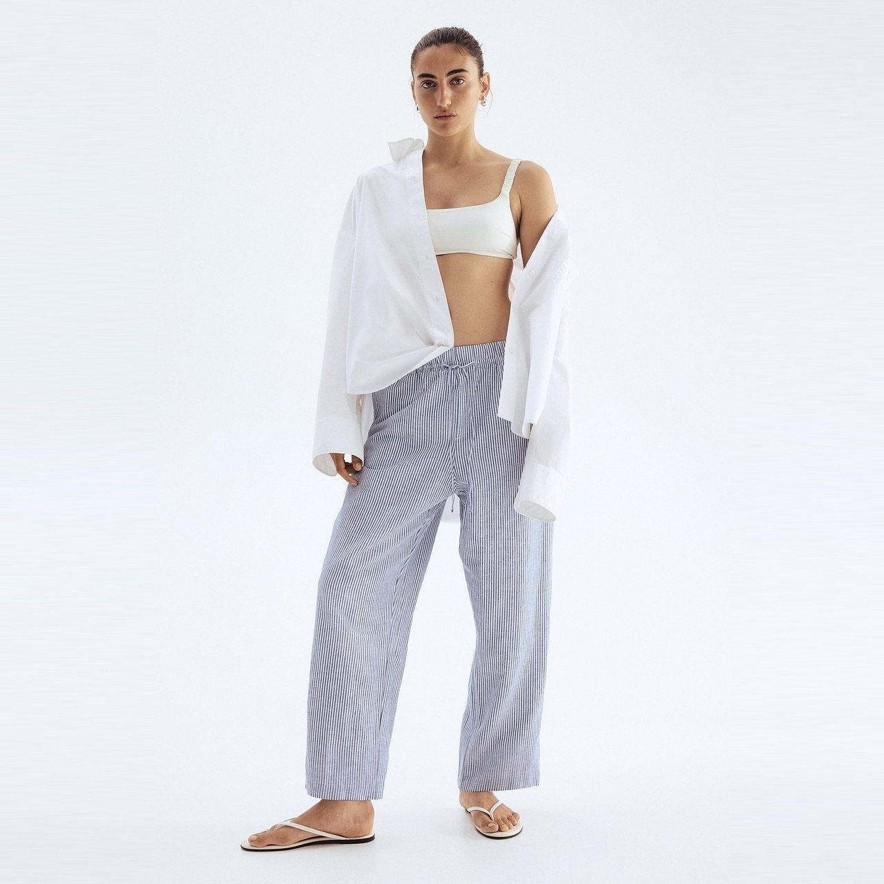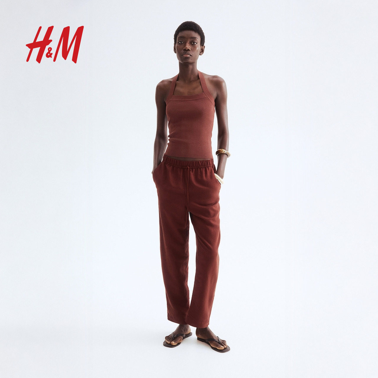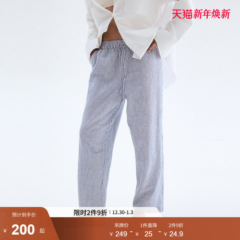 HM冬季新女装款时尚舒适亚麻混纺抽绳长裤1259083