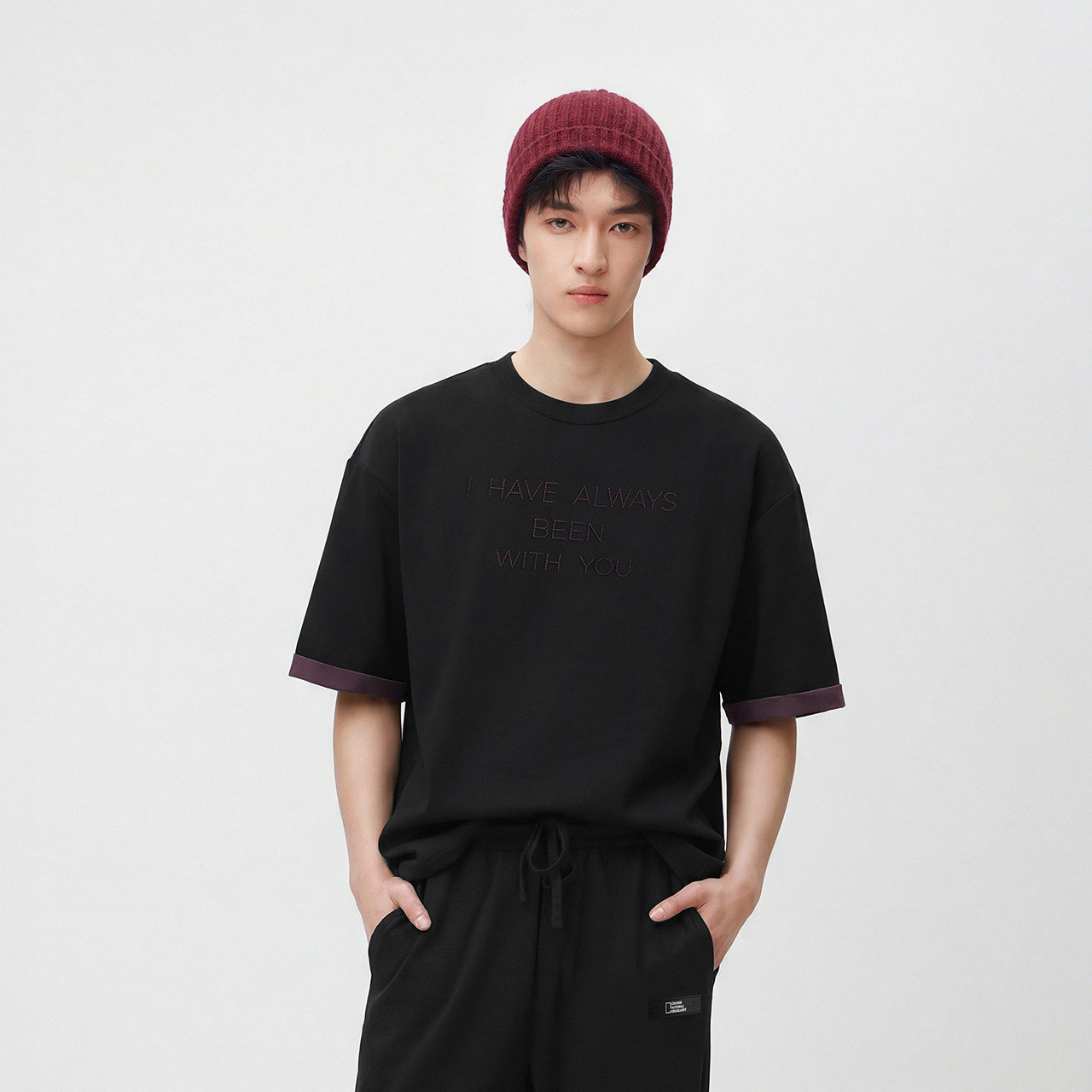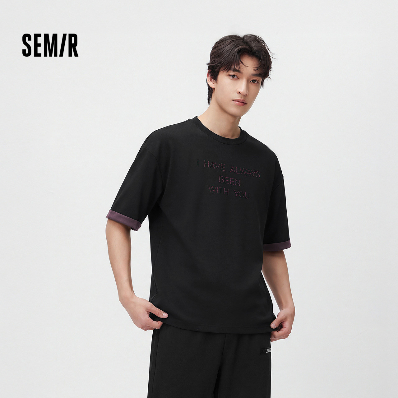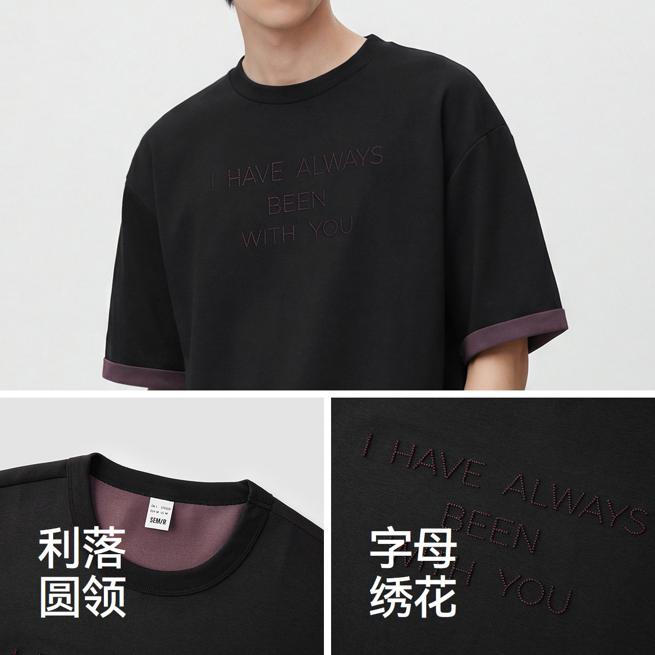森马短袖T恤男夏季简约字母绣花针织衫撞色双面宽松圆领上衣时尚