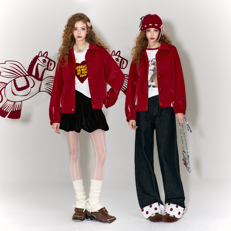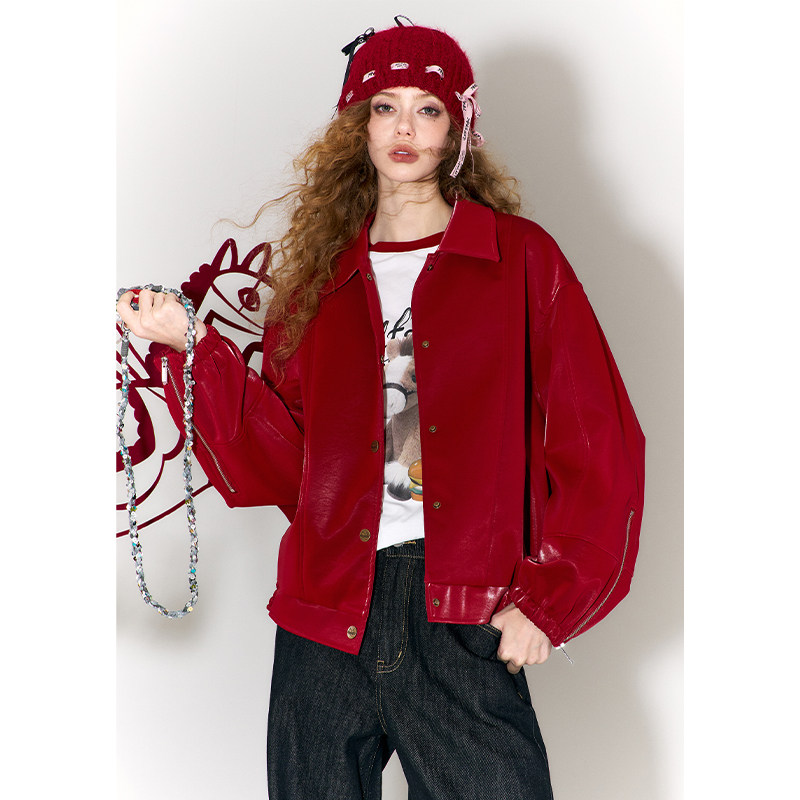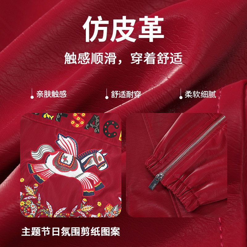 妖精的口袋剪纸小马绣花红色皮衣女2026年冬季新款重工设计感外套