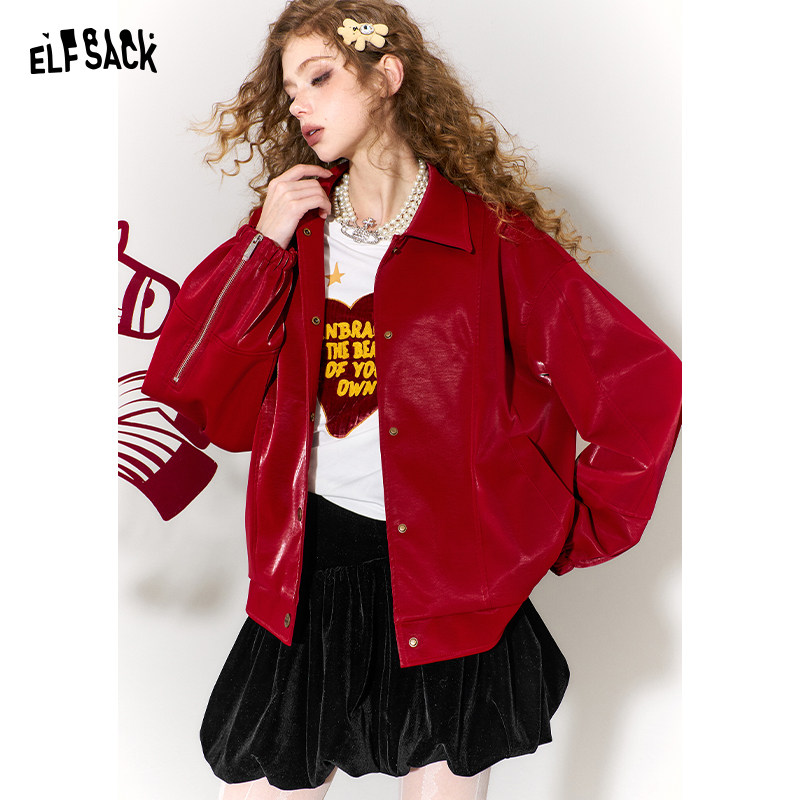 Eland衣恋皮衣女纯色带拉链长袖翻领外套2025冬季新款