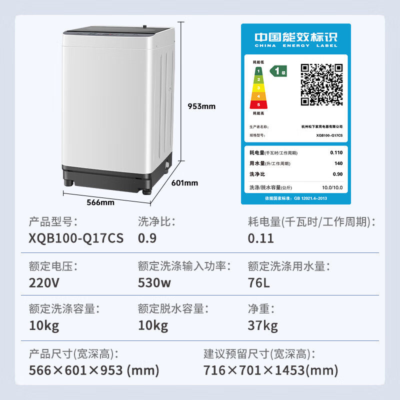 松下全自动10kg波轮洗衣机1级能效家用大容量除螨抗菌羊毛洗Q17CS