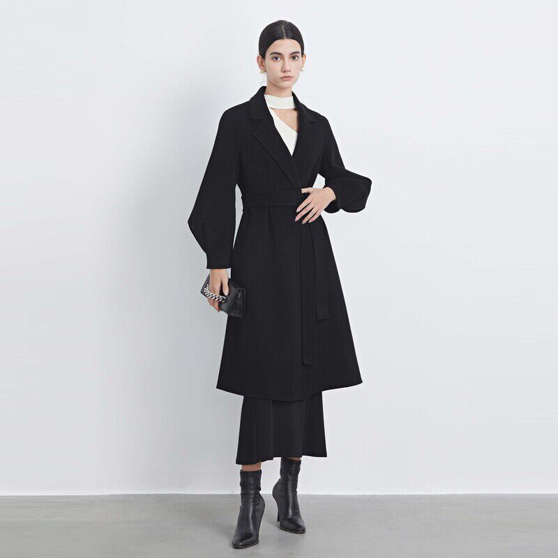 COCOBELLA设计感假两件大翻领毛呢外套女秋冬新款黑色大衣WL0002