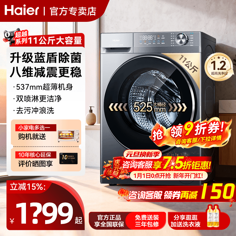 海尔洗衣机以旧换新补贴滚筒超薄11kg/10kg家用全自动58e洗烘一体