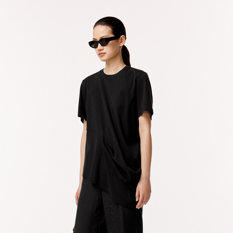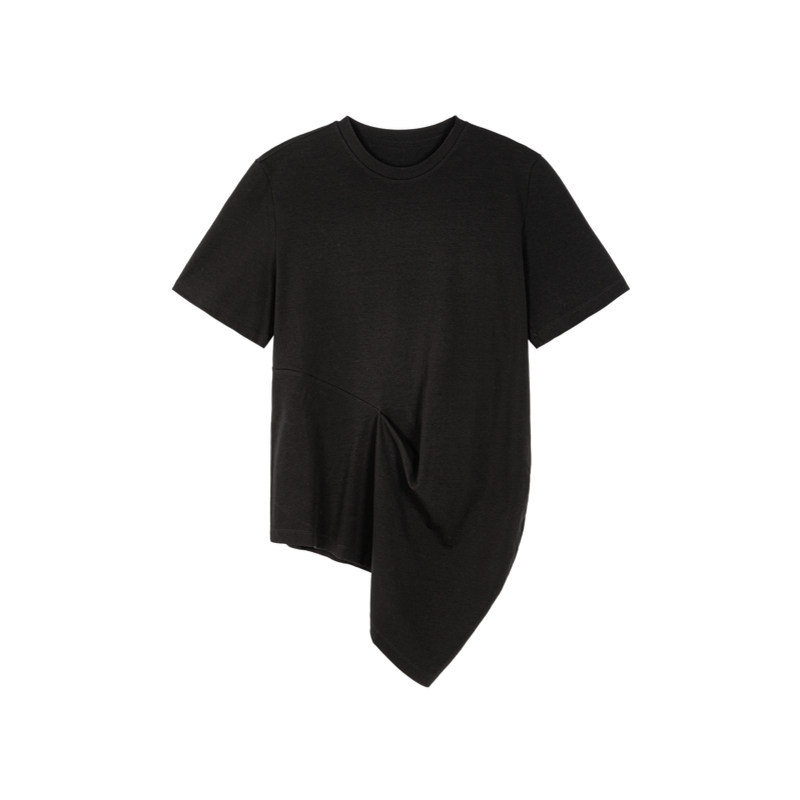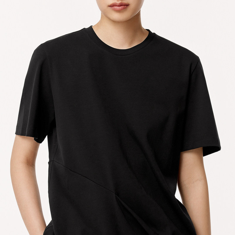 LESS夏季休闲简约圆领短袖T恤女含棉黑色时髦不规则上衣2O5114280