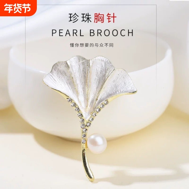 诸暨淡水珍珠银杏叶胸针高级名媛气质女人胸花经典百搭七夕节礼物