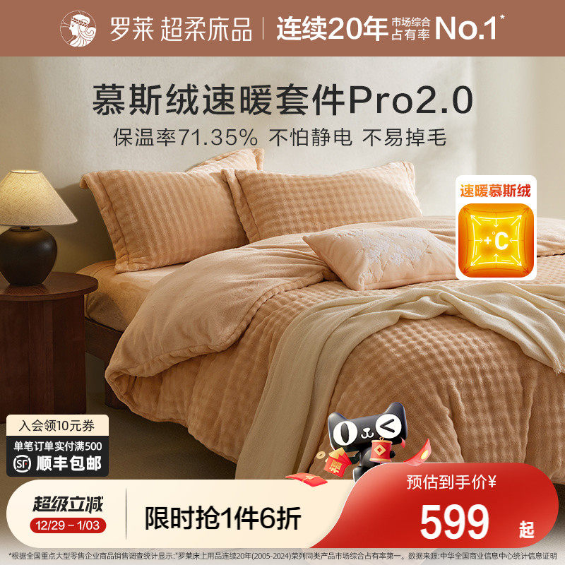 罗莱家纺秋冬新品长毛绒慕斯绒双面暖绒加厚床单被套双人床四件套