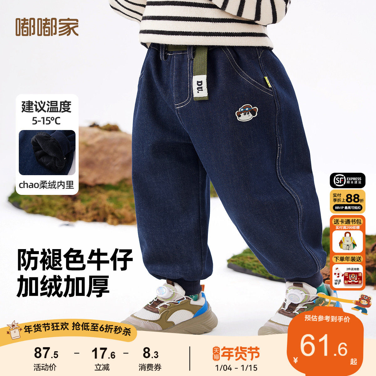 [骏马福裳520G]齐齐熊宝宝裤子加绒加厚冬款男童牛仔裤保暖裤新年