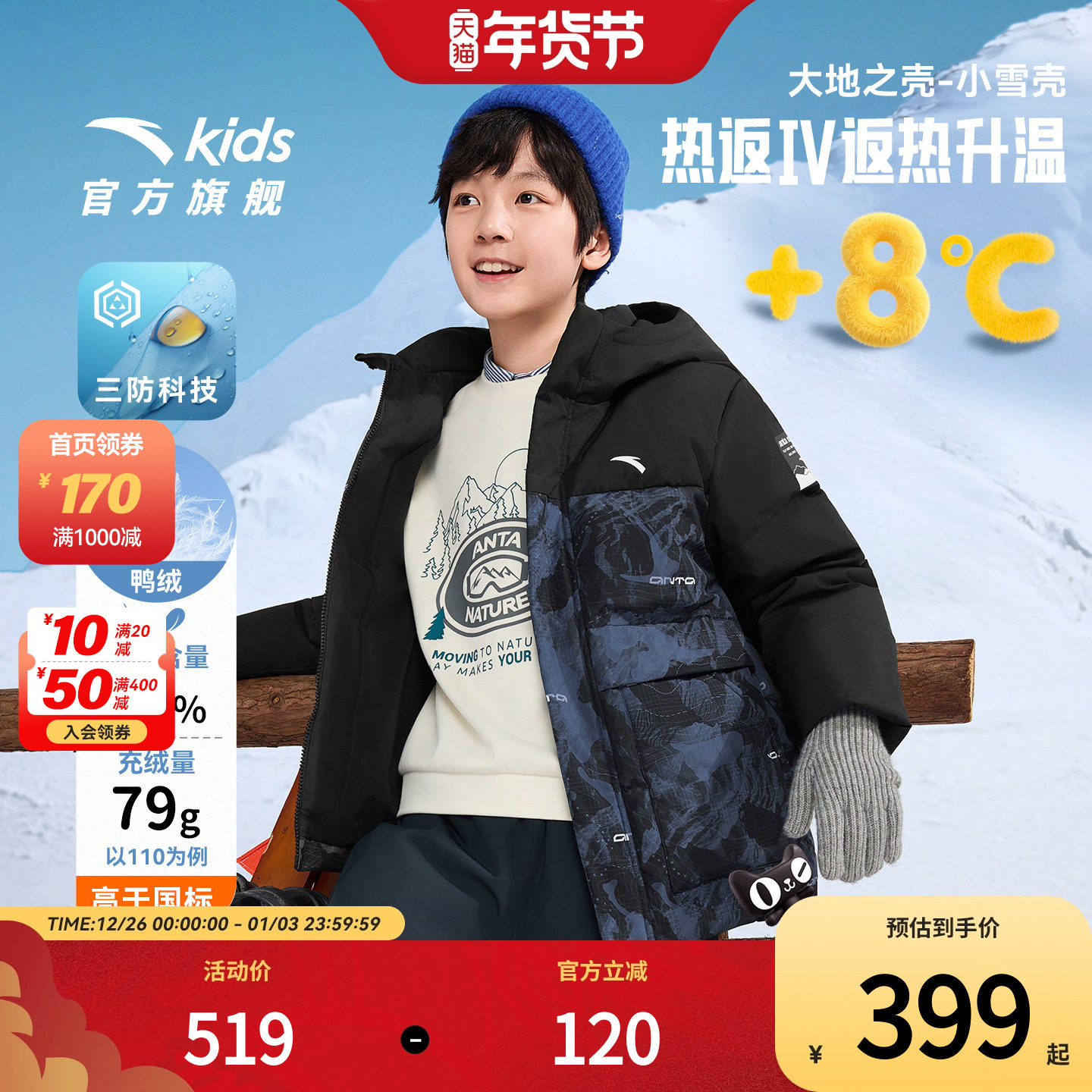热返科技安踏儿童羽绒服2025冬新款三防加厚保暖四防连帽男童外套