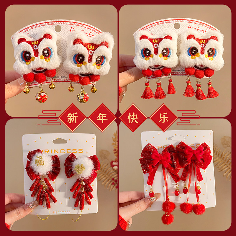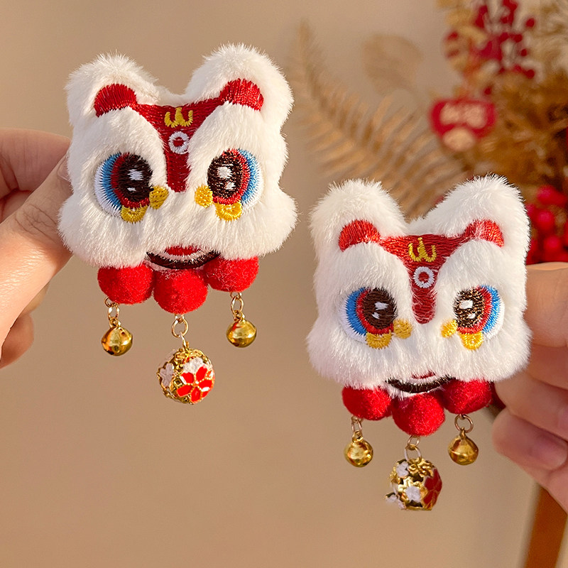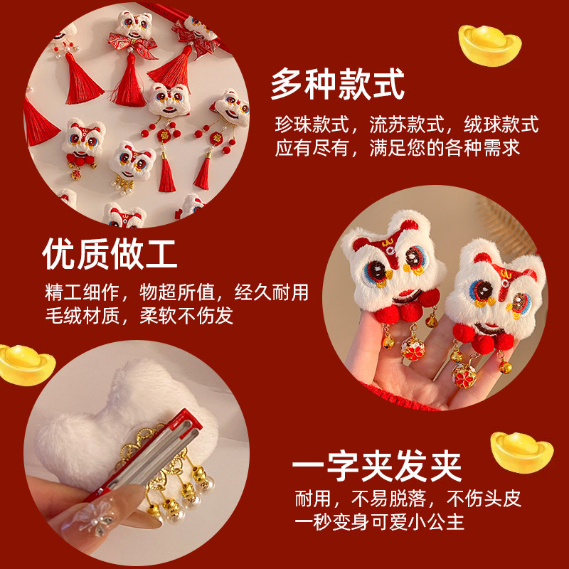 新年红色醒狮毛毛流苏发夹女新中式丸子头发卡中国风旗袍汉服配饰