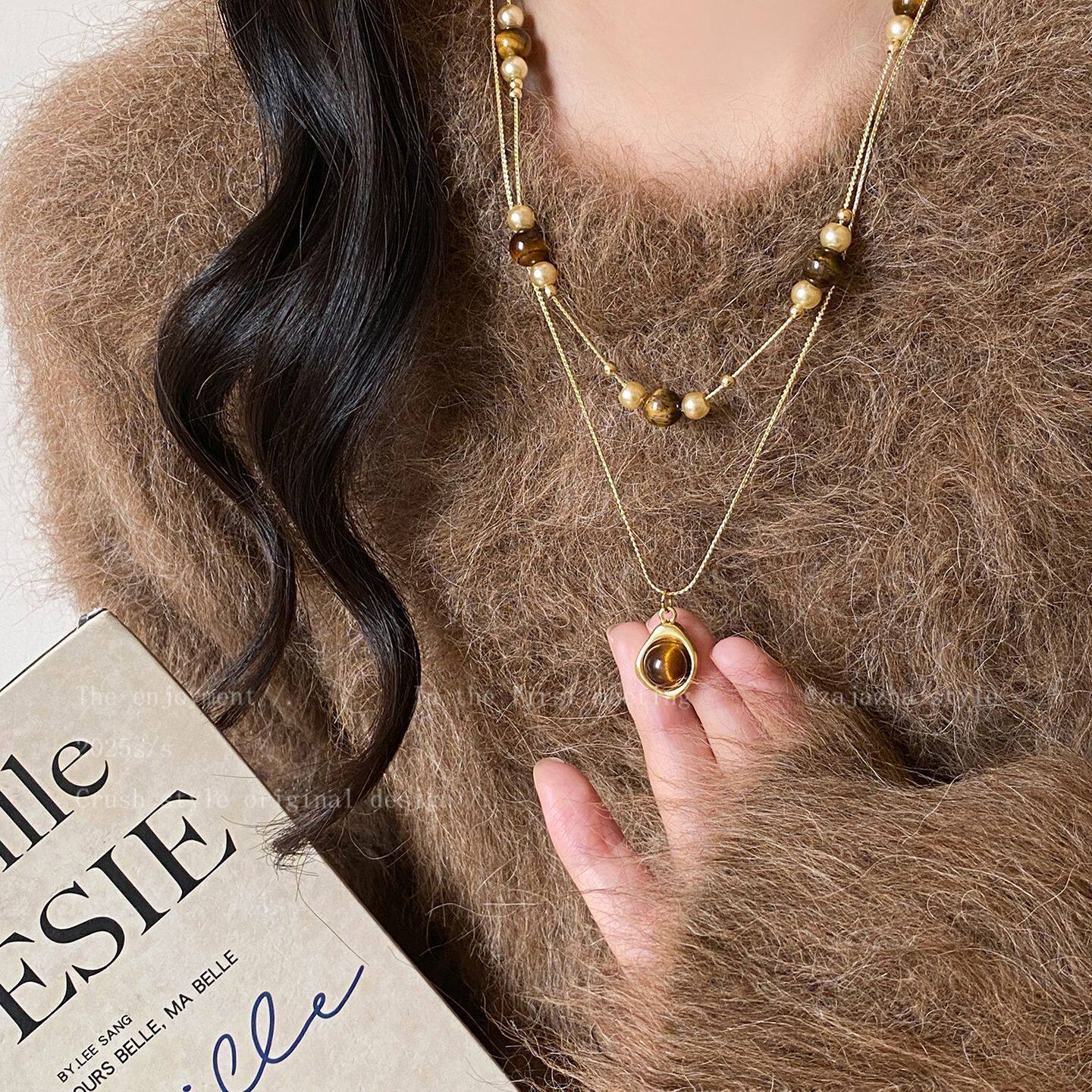 美拉德虎眼石珍珠项链女秋冬季2025爆款百搭轻奢高级感长款毛衣链