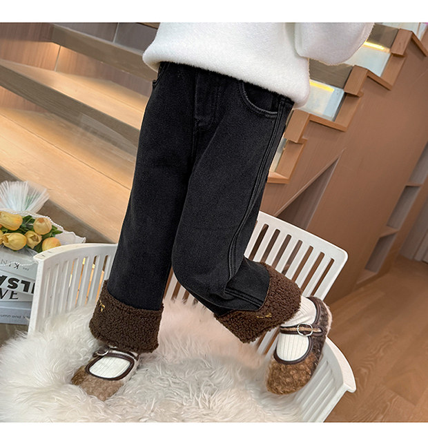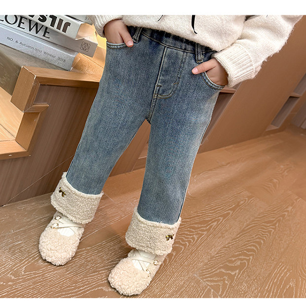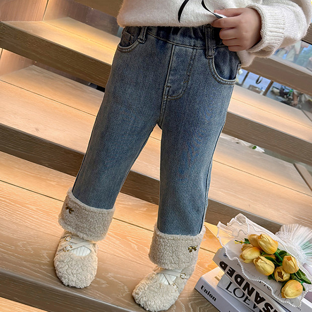 女童牛仔裤子秋冬款2025新款儿童冬季加绒卷边女孩宝宝加厚直筒裤