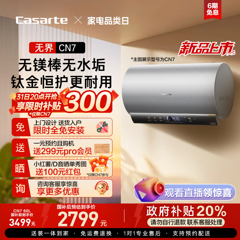 焕新补贴卡萨帝电热水器60/80升洗澡家用圆桶CN7变频节能无镁棒
