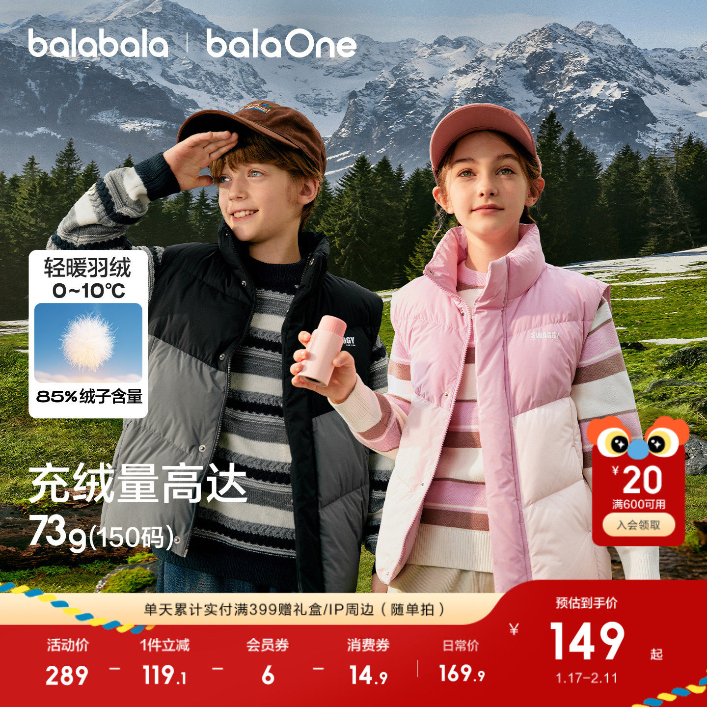 巴拉巴拉balaOne儿童羽绒马甲女童男童小童外套新款童装2025秋冬