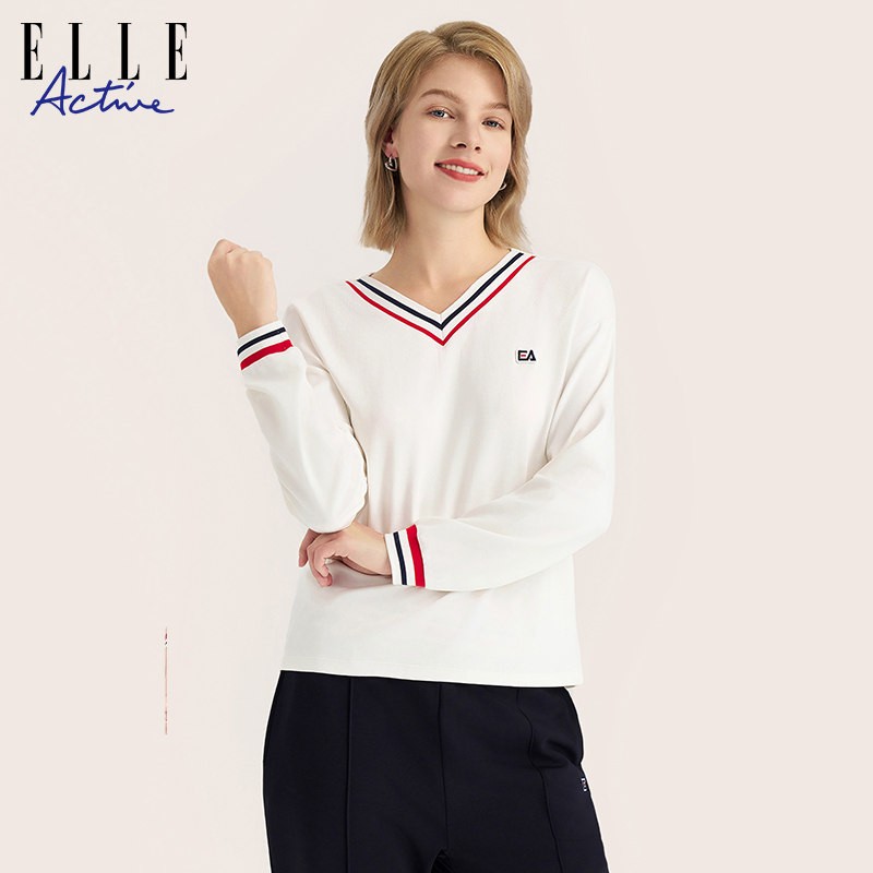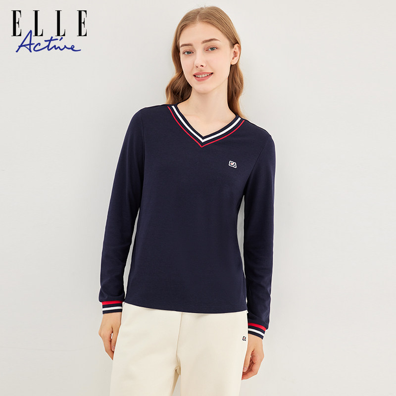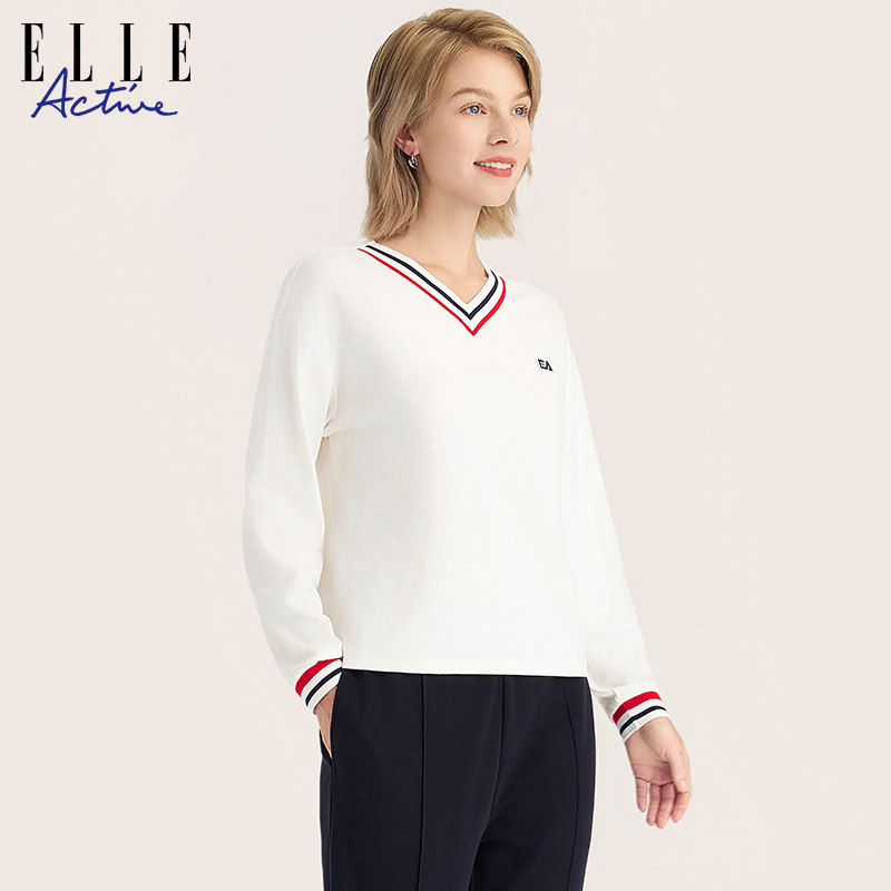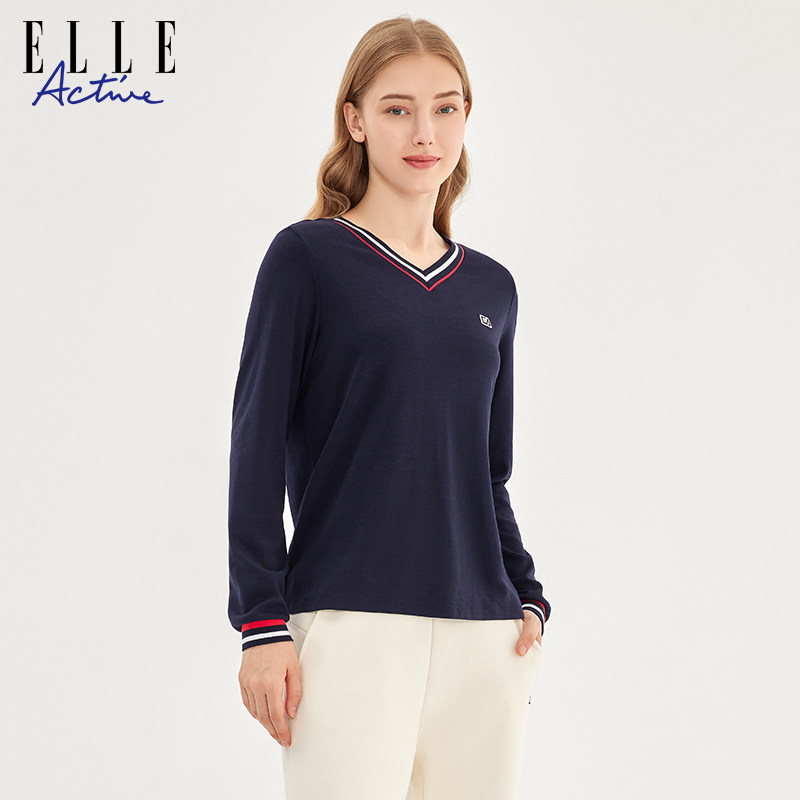 ELLE Active2023秋冬新款简约百搭V领撞色长袖T恤运动休闲上衣女