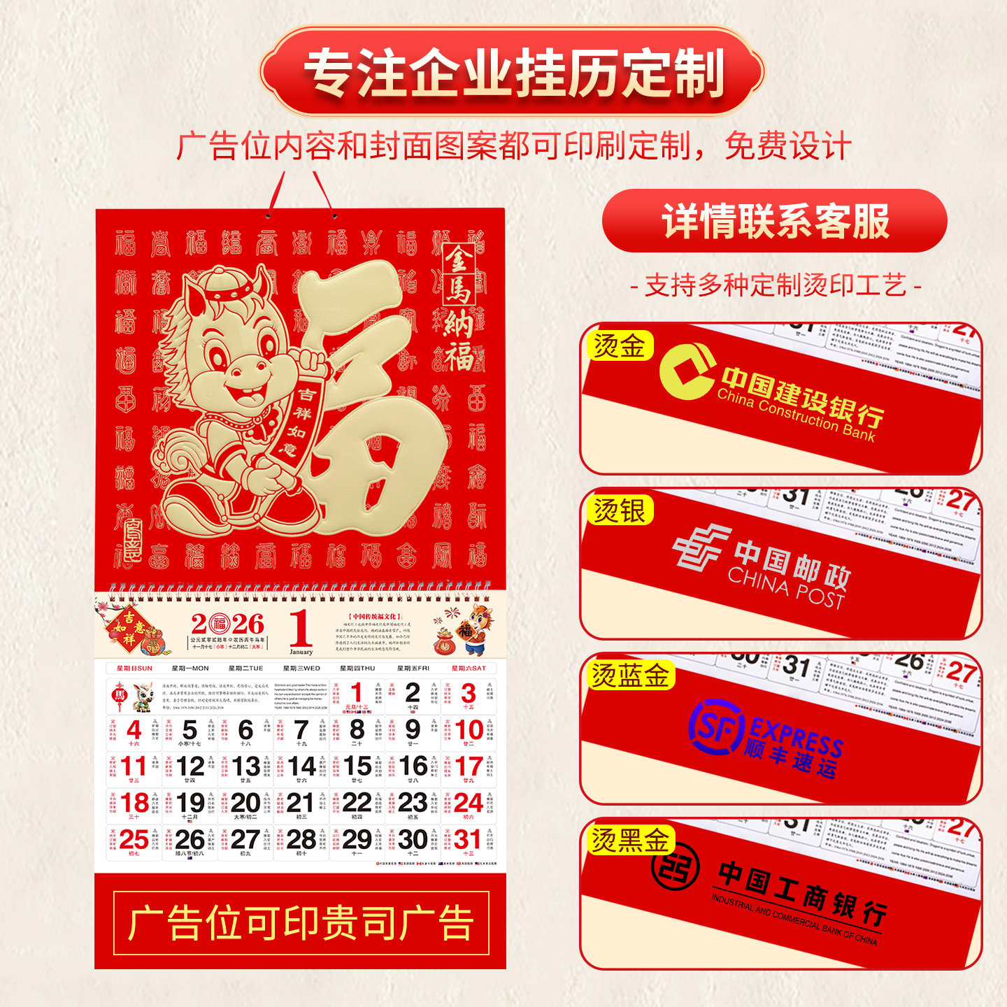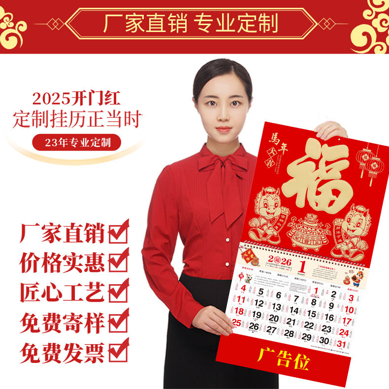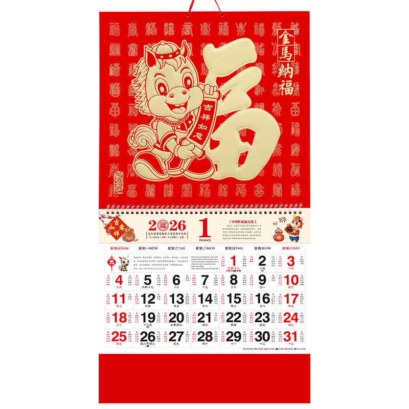 金箔福牌吊牌2026新款马年福字挂历定做公司企业广告百福字吊历月历日历印刷家用挂墙保险2025年年历设计定制