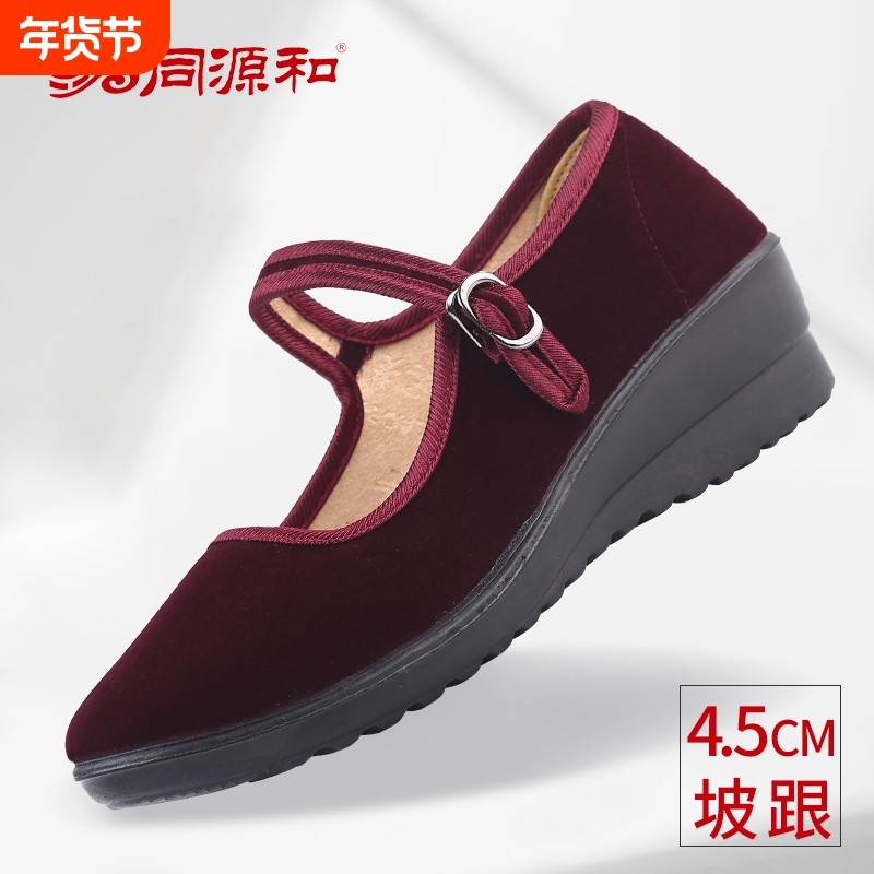同源和老北京布鞋女酒红色平绒透气坡跟工作模特大红礼仪鞋跳舞鞋