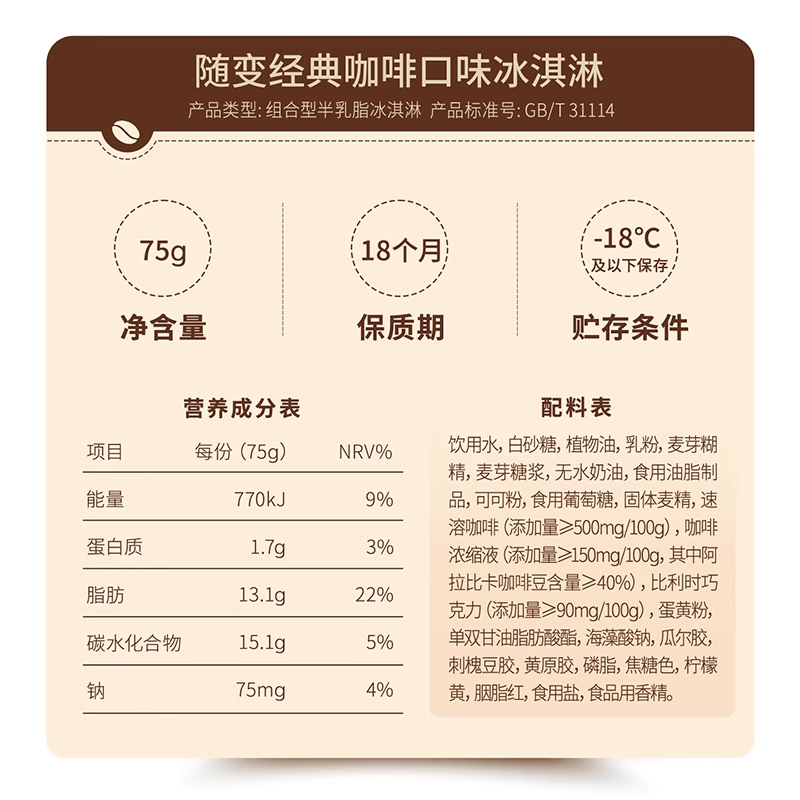 蒙牛随变冰淇淋75g经典咖啡口味阿拉比卡咖啡豆冰激凌