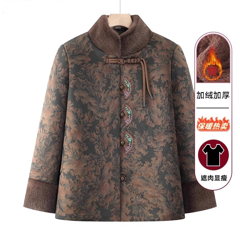 妈妈秋冬季加绒外套女中老年人大码宽松翻领棉衣三层加厚棉服上衣