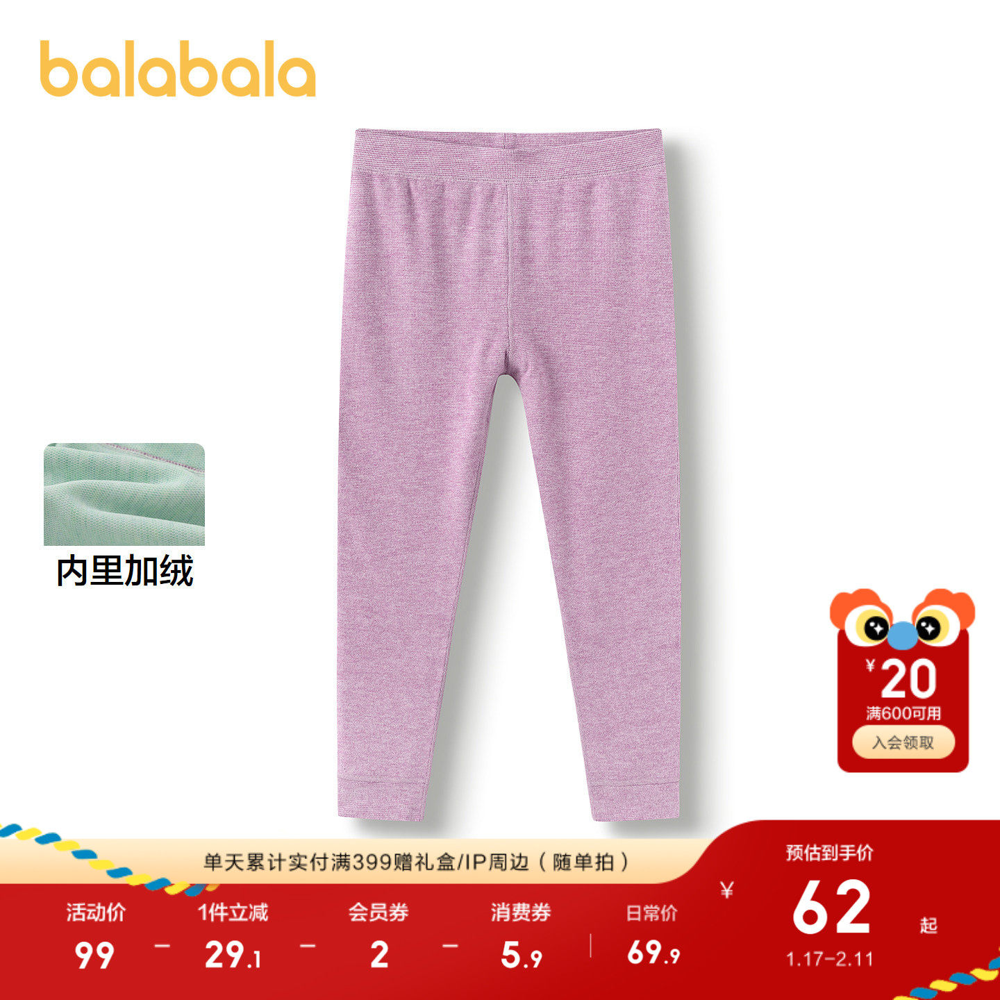 巴拉巴拉男女保暖裤儿童睡裤打底裤童装秋冬纯色柔软保暖舒适亲肤